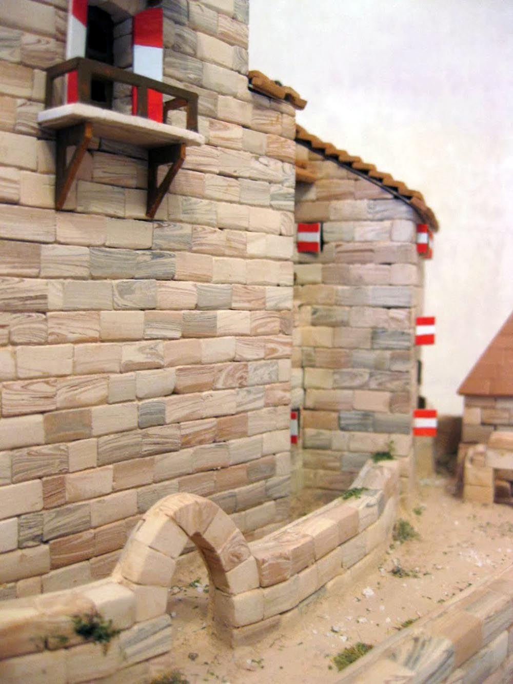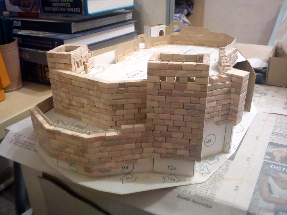 На каждой стене есть сетка, указывающая, что здесь должен быть кирпич. Старайтесь соблюдать прямоту ряда по этой сетке! Если начнётся искривление ряда, тут же – надфиль и нож в руки - и править кирпичи. Наметившаяся кривизна прогрессирует с пугающей динамикой. Я обычно правлю не реже чем через пять рядов, а то и через три ряда - лучше предупредить, чем мучиться и стачивать горбы. Особенно надо быть внимательным на предпоследнем ряде, тем более если стена увенчана бойницами. И не жалейте клей! Я иногда просто проливаю ряд со стороны каркаса, клей быстро уходит внутрь и ещё лучше скрепляет ряды.