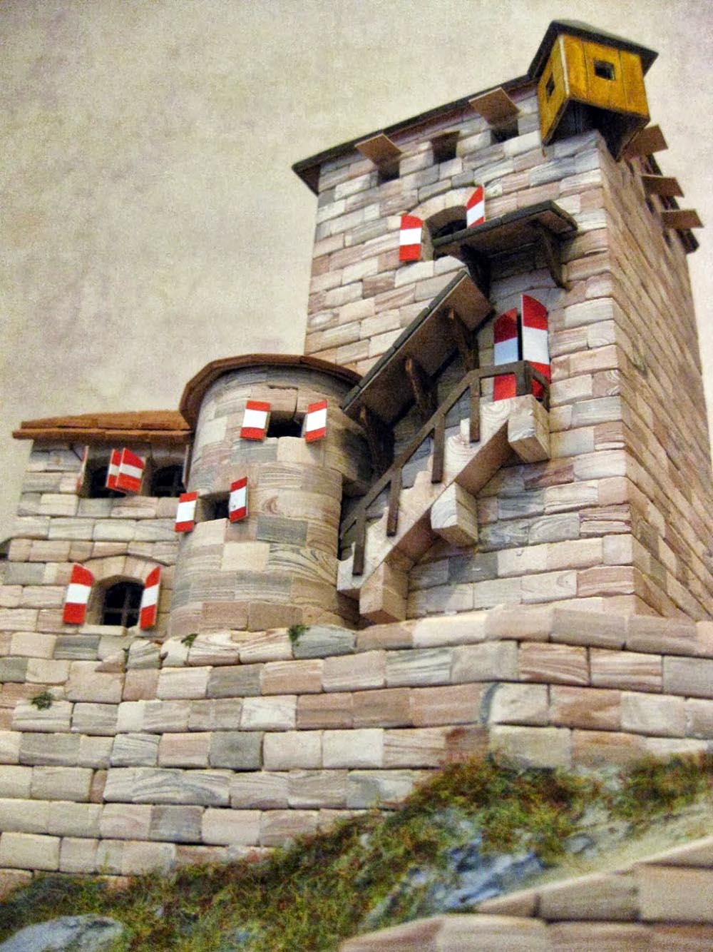 Итак, вот и кровля собрана. Сейчас не повредит обвесить башни всем тем, что пока ещё не подвешено. Для Burg Branzoll это балконы, лестницы, ставни. Из всего этого наименее приятными оказались ставни. Их сначала нужно было раскрасить, а потом вырезать. Приклеивались они поначалу так себе, потом приноровился. Ещё красить нужно было «скворечник» под крышей цветом «под дерево». Все покраски я сделал акриловой краской, просто потому что она не стирается с гладкого картона. Кстати, из-за этого «скворечника» довольно долго пришлось повозиться с его примыканиями на кровле.