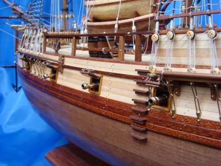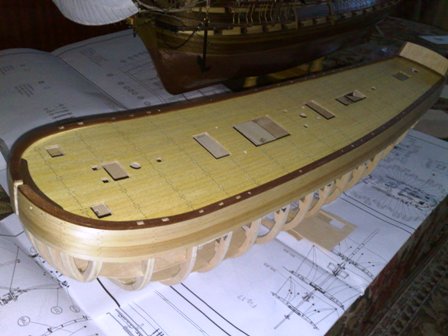 Затем бархоуты и чистовой набор темным орехом. Разметка и прорезание портов - сразу перед полной шлифовкой корпуса. Границы, где находятся палубы, очерчены 6-й рейкой и прошивкой бортов гвоздями. Пушечные порты применил готовые, литые из силумина 13Х13мм, немного доработал фрезой и крышки изготовил из рейки ореха.