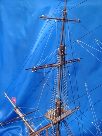 Штаги свивал вручную, их не так много и городить какие-то приспособы смысла нет. Все остальные канаты- нитки из ассортимента магазина. После обвязки вант выбленками пропитал последние разбавленным нитролаком и отформовал жалом разогретого паяльника. Поскольку модель без парусов, то пришлось внести небольшие дополнения в оснастку реев, их я взял из чертежа английского линкора Vаnguаrd, современника Баунти