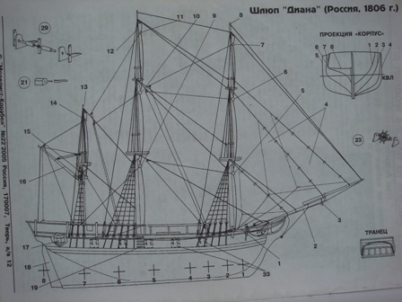 Как-то купил в SMC у Овсянникова С.К. набор Баунти. То, что я получил, озадачило. Фототравленки не было вообще, вся лазерная резка такого качества, что хоть сразу на выброс. На входе луча все ровно и красиво, а на выходе такие немыслимые зигзаги, что если их выбирать шлифовкой, то от деталей ничего не останется. Пускать на запчасти этот хиленький кит было жалко, решил конверсировать в наш шлюп Диана. Идеей конверсии вдохновился из статьи в журнале "Моделист-корабел" №22 от 2005г. В ней приведена краткая историческая справка по кораблю и обоснована возможность конверсии Баунти (см. начало обзора).