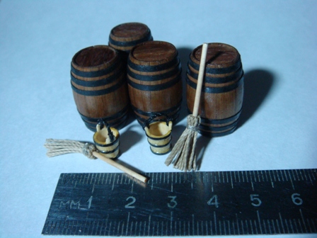 Ведра из набора Баунти доработал на токарном и там же нарисовал черным маркером обода. Для бочек изготовил деревянные