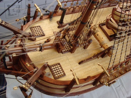 Также сразу встает вопрос - в каком виде строить модель, парадно-блестящем или максимально приблизить цвета к реальным, т.е. лакировать и красить без глянца, металл пушек и др. зачернить под чугун и железо и т.д. В каждом свои преимущества и свои сложности, я выбрал первый вариант и под него уже подбирал материалы, которые приобретал в местном магазине: рейка красного дерева 2Х8 , темного ореха 0,5Х6 для обшивки, липа 2Х3 для весел, шикарная подставка из темного ореха, гвозди d 0,5 и 0,7. Конструктивные изменения - установка 10 пушек по линии твиндека.