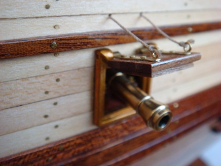 Рассчитывая на многолетнюю службу модели, очень внимательно отнесся к покрытию как дерева, так и металла. Использовал "Яхтный лак" производства С-Петербург. Дерево- первый слой разбавленным лаком пропиточный, потом еще 2-3 слоя с промежуточной шлифовкой. Стволы пушек, отполировав в токарном, окунал в лак, предварительно разогрев на подошве утюга.