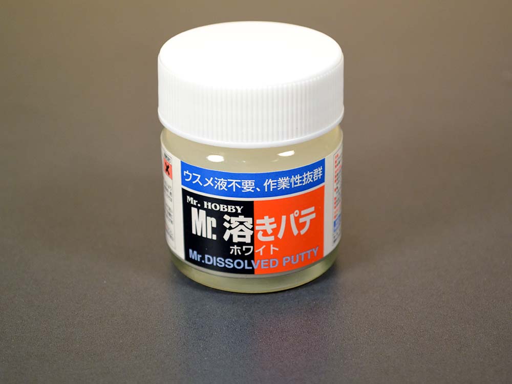 Mr. Dissolved Putty — уже совсем жидкая шпаклёвка, практически самостоятельно затекающая в полости. С ней легче всего исправлять неровные участки деталей (особенно большой площади), а также заполнять мелкие дефекты. Ко всему прочему её можно дополнительно разбавить с помощью Mr. Thinner.