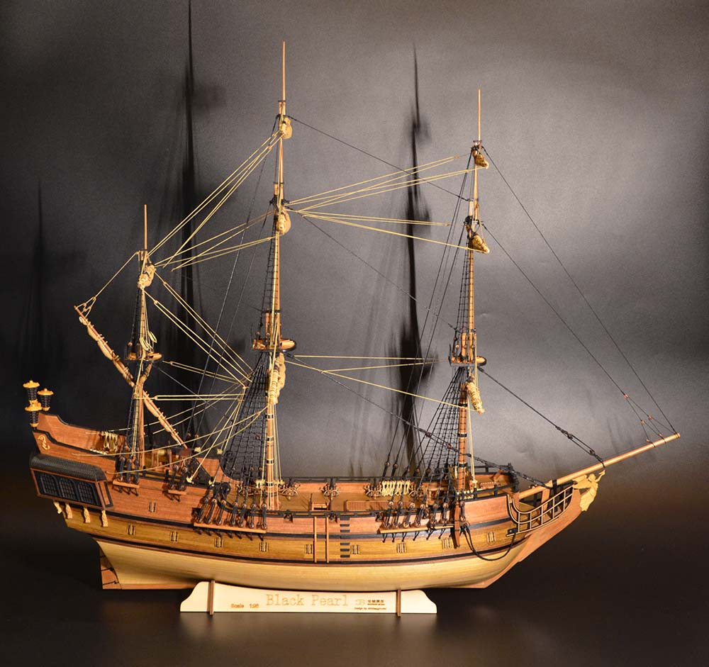 Очередная - и на данный момент лучшая - модель "Чёрной Жемчужины". Большая и сложная модель с чистовой обшивкой из нескольких пород дерева. Большое количество материалов, мелочёвки и готового декора (3D печать). Несомненно очень интересный проект не только для любителей фильма, но и для любого судомоделиста. Однако уровень сложности довольно высок, поэтому настоятельно рекомендуем только опытным моделистам.