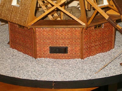 Элемент питания (две батарейки «Крона») я спрятал за второй дверью в мельницу, которая находится в фундаменте. Эта дверь выходит как бы в подвал мельницы нижней частью, а верхняя выходит на первый этаж. Именно в подвале и будут располагаться батарейки. Дверь я не стал приклеивать к стене, дабы можно было менять батарейки, а просто наклеил сзади две реечки параллельно стенам, чтобы дверь не выпадала. А перед дверью сделал что-то типа порога, чтоб туда не засыпался гравий, и дверь можно было свободно вынимать.
