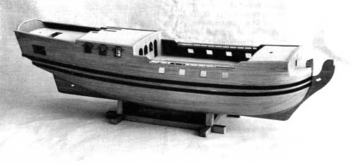 Сделав это, отложите модель в сторону и займитесь подставкой под нее. Это та деталь, которая по мере изготовления модели будет оказывать все более и более существенное влияние. Дизайн подставки должен быть функциональным и красивым, но не переусердствуйте до такой степени, что подставка будет отвлекать внимание от самой модели. Подставка, которая держит корпус в вертикальном положении при взгляде с носа или кормы и с ватерлинией, параллельной столу, на котором стоит модель, когда на нее смотришь с борта, очень поможет при разметке ватерлинии.