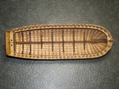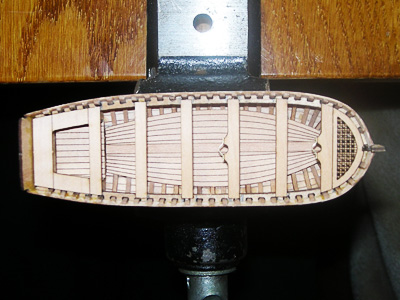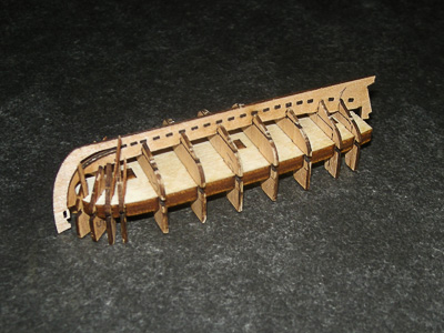 На горизонтальной части шпангоутов приклеил палубу, а поверх нее и верхней кромки килевой рамки приклеил кильсон.
