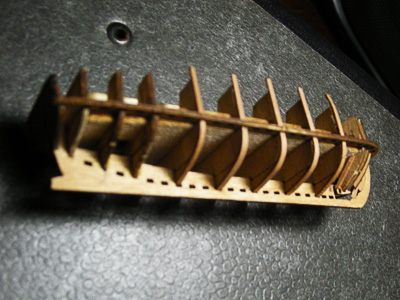 Из пластины № 4 рейки под номерами 17-20 вставил с обоих бортов от носа к корме и приклеил в паз килевой рамки и верхней части полушпангоутов, пропустив через отверстия в подлегарсе. По инструкции вставил два промежуточных шпангоута в кормовой части шлюпки. Для этого необходимо было провести разрезанные пополам и намоченные в воде рейки №21 в свободные отверстия в подлегарсе. Потом уже вклеил в соответствующие два отверстия в килевой рамке между двумя шпангоутами в кормовой части шлюпки.