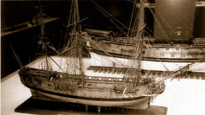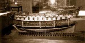 Bon Homme Richard Американский 70-ти пушечный корабль, 1779 год. Хотя эта модель является исключением в коллекции Роджерса (она выполнена в наше время), но она стоит рядом со всеми другими моделями и обычный посетитель не способен отличить ее от других. Bon Homme Richard, переоборудованный из французского торгового судна le Duc De Duras и переданный американцам, является хорошим дополнением к моделям коллекции, намного старшим его. Эта великолепная модель была построена канадским моделистом Бобом Куком (Bob Cook). Данная фотография показывает квартергалерею правого борта и три длинных пушки на нижней палубе. Модель представлена на стапеле с кирпичным основанием, подпорками и рельсами. |