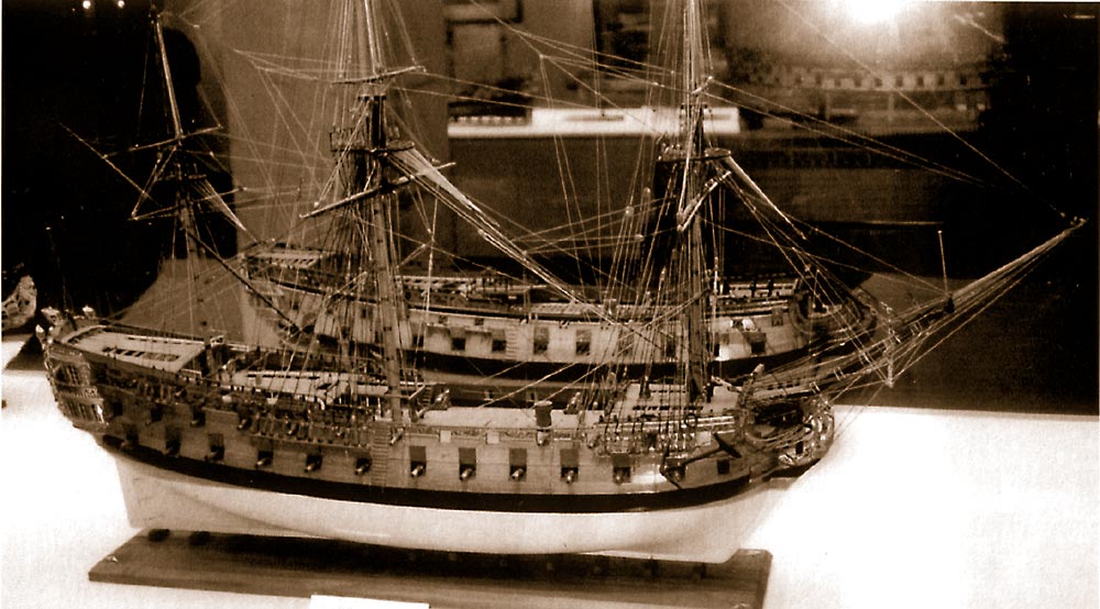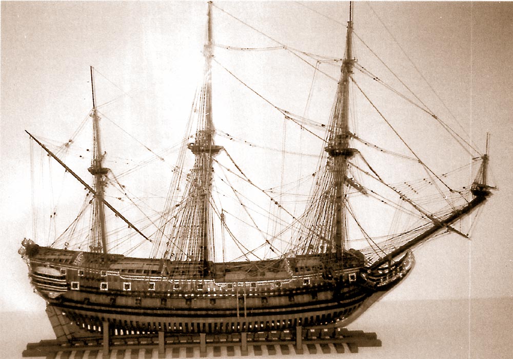 Неизвестный английский 80-ти пушечный корабль третьего ранга, приблизительно 1692 год. Масштаб 1:48, длина 1200 мм, высота 380 мм, ширина 280 мм. |