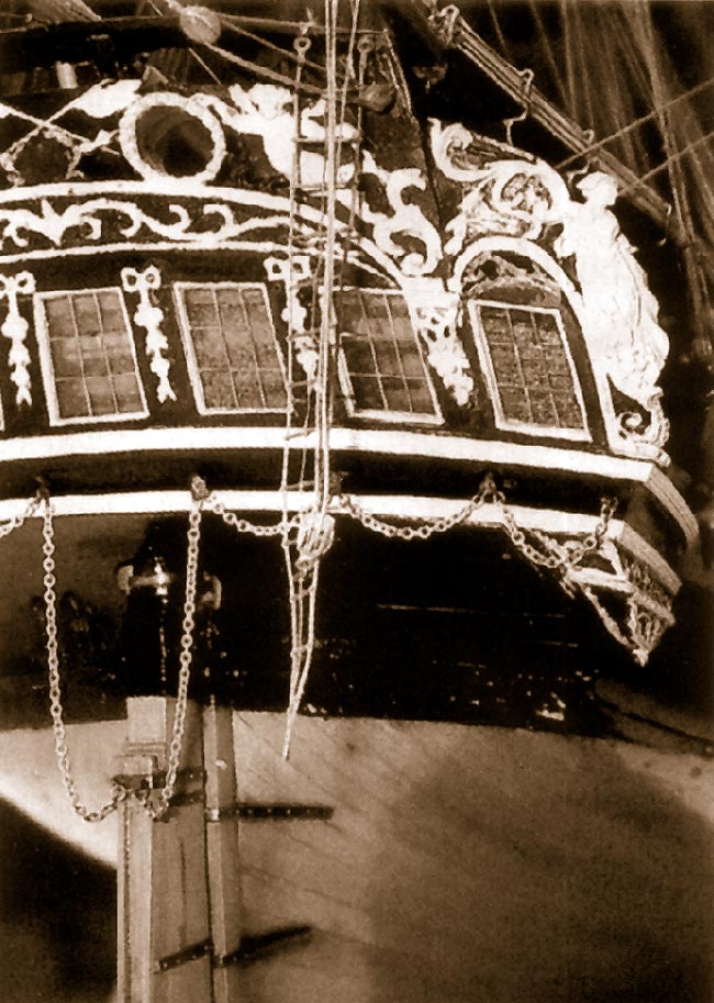 Bon Homme Richard Вид на корму показывает галереи, эмблему с названием корабля, резьбу и два пушечных порта. Обратит внимание, что перо руля имеет прорезь на своей задней кромке. |