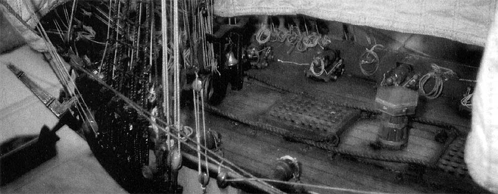 Вид на ванты фок-мачты, шпиль и на якорный канат с кабалярингом. Доски палубы производят впечатление очень широких. Палуба выполнена из дуба и обработана маслом, шпиль окрашен в красный цвет с позолоченными скрепляющими обручами. Фальшборта изнутри красные, как и комингсы люков. |