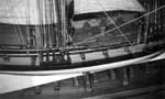 Вид с правого борта на носовую часть корабля. Виден шкот фока, лисель, ундер-лисель-спирт и судовой колокол. |