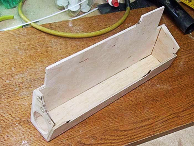 Из фанерки режем прямо по месту. Сначала два торца, один из них с дыркой под трубу. Режу их вместе, чтобы одинаковые были. Затем прикручиваю саморезами к шлифовке. И прямо по месту начинаю вырезать все остальные куски. Хуже того, сажаю фанеру там, где она со шлифовкой сопрягается, а то, что она на создаваемой вытяжке где-то торчит, так и ладно, после склейки сошлифую. Получаю такое вот корыто: