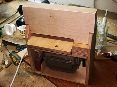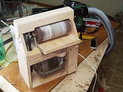 Ну и кто тут у нас самый пыльненький? Ясен пень, шлифовки всякие! Смотрим на покупные - точно, есть там дырочка для надевания пылесоса. А на самодельной барабанной, увы... Значит, надо делать. Конечно, из подручных материалов. Здесь вам не тут, здесь что нашлось, то и пригодилось. Обрезки фанеры вполне подходят. Выглядело это вот так:
