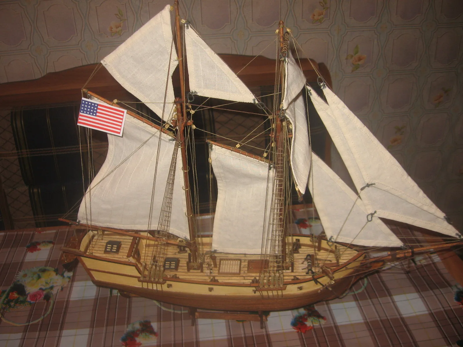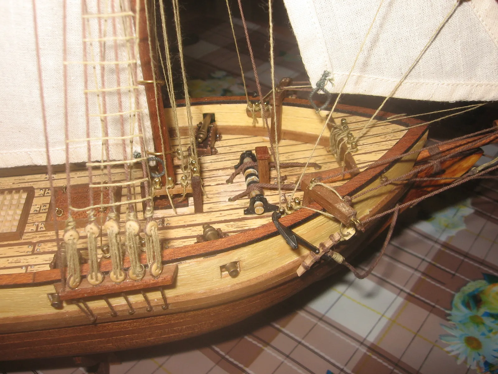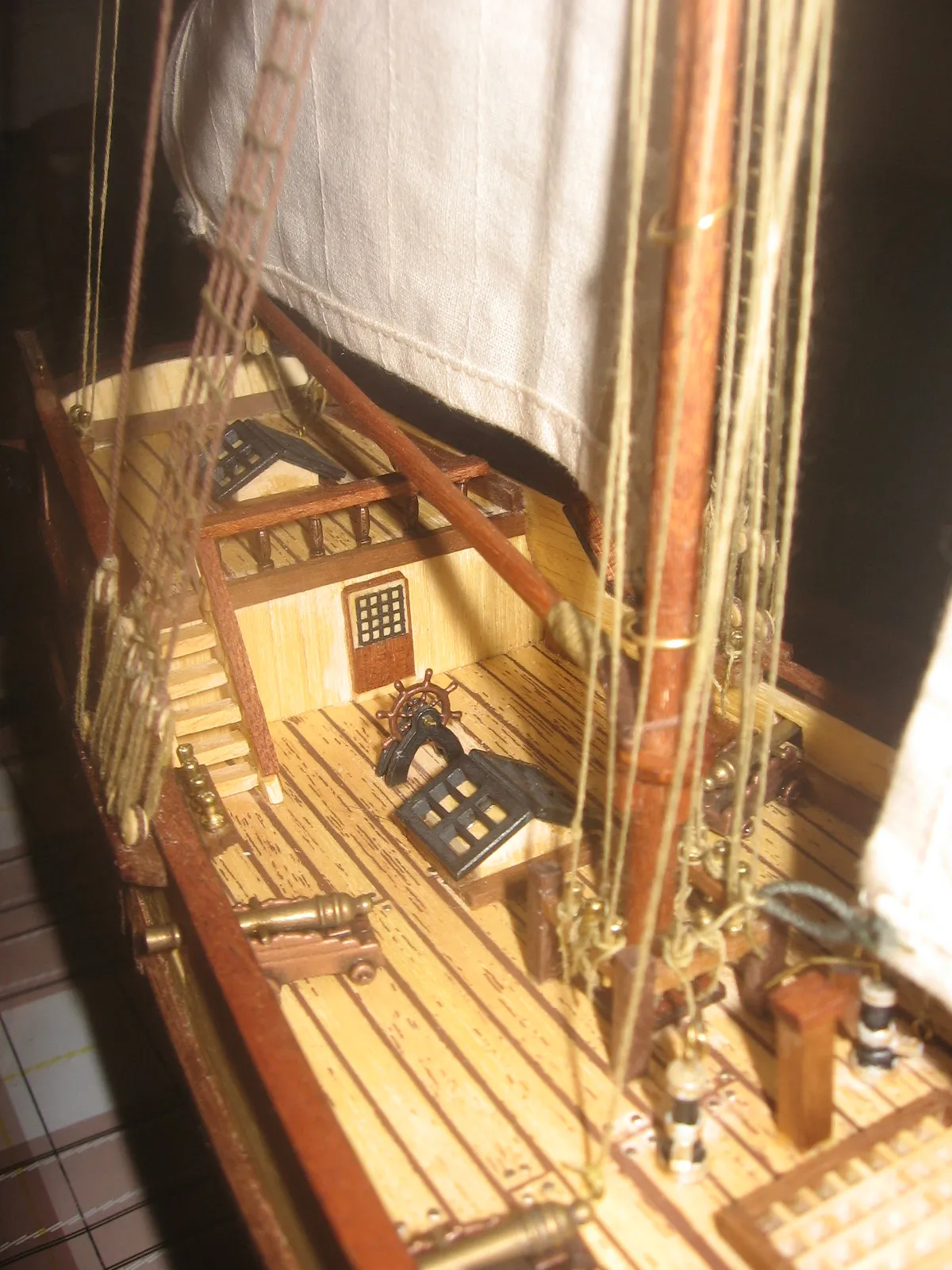 Это первая моя модель из набора. Модель фирмы "OcCre". Схема сборки представляет все основные этапы сборки модели на понятном для моделистов языке. Внёс небольшие изменения... Сделал трап из дерева, шток на якоре тоже из дерева, дверь в каюту сделал новую, шлюпку изготовил по принципу папье-маше, прошпаклевал палубу, чтобы более чётко выделить места разделения палубных досок, а прибивал палубные доски швейными булавками с плоской головкой, всё судно покрыл бесцветным пчелиным воском. Все эти изменения были внесены на основе знаний, полученных в результате общения на форуме "Верфь на столе"! С уважением Алексей Золотняков!