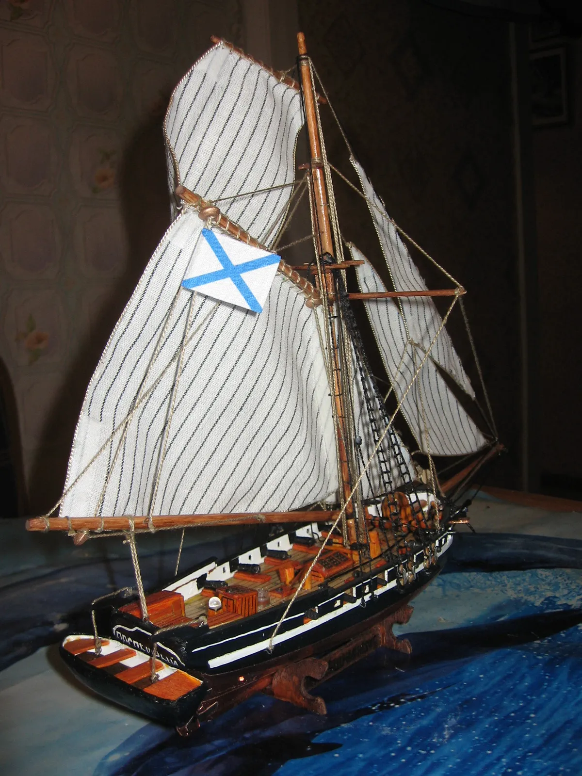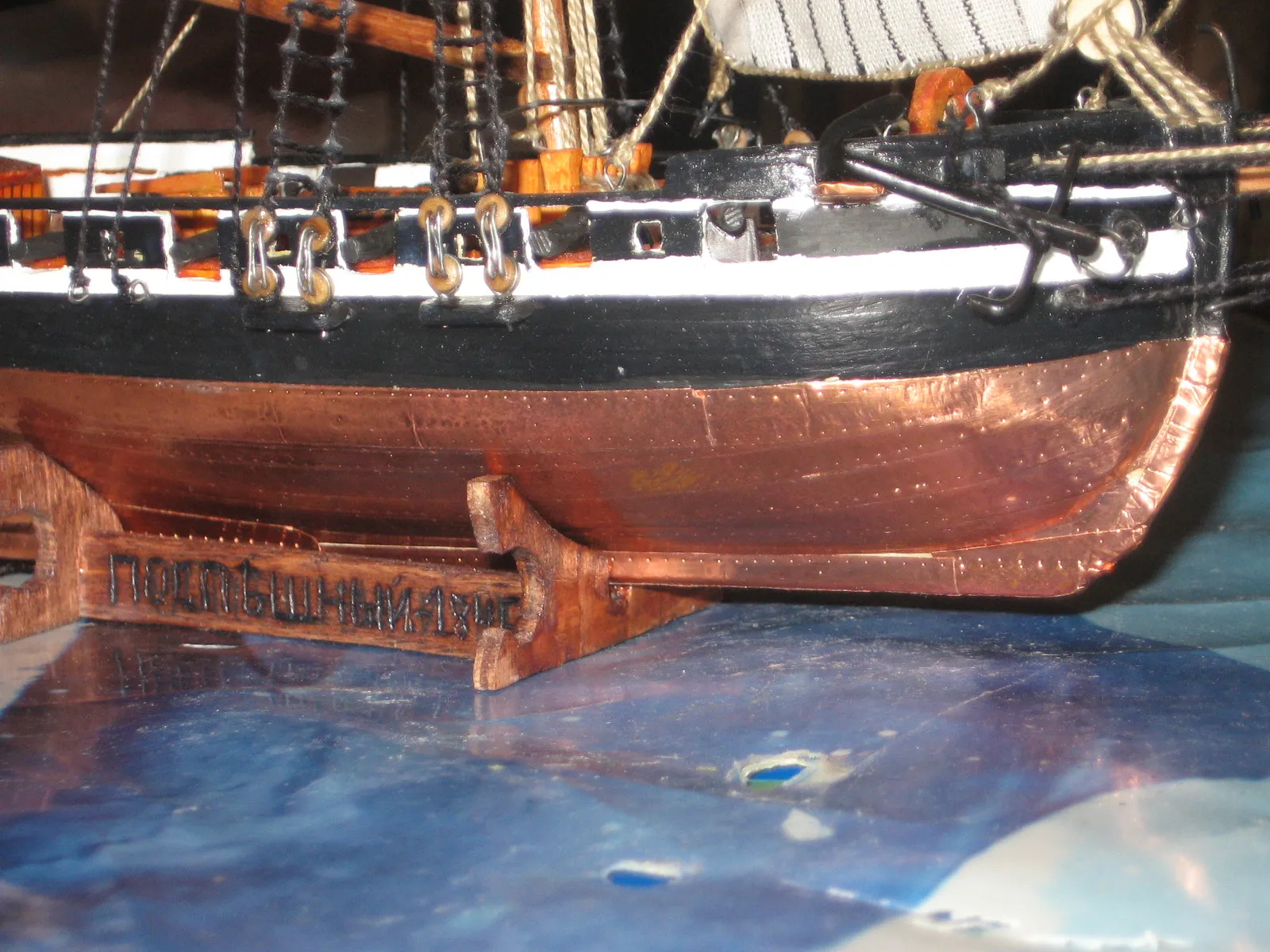 Модель строилась по чертежам бумажных кораблей фирмы SHIPWORKS, приобретённых в "Верфи на столе". При изготовлении использовал фанеру 3мм, шпон и др. Краски использовал акриловые. Днище покрыто медной лентой 6 мм, приобретённой в "Верфи на столе", места прибивания к днищу имитировал с помощью швейного колёсика для разметки ткани. С помощью ручной горелки изготовил металлический якорь. И впервые выливал пушки.