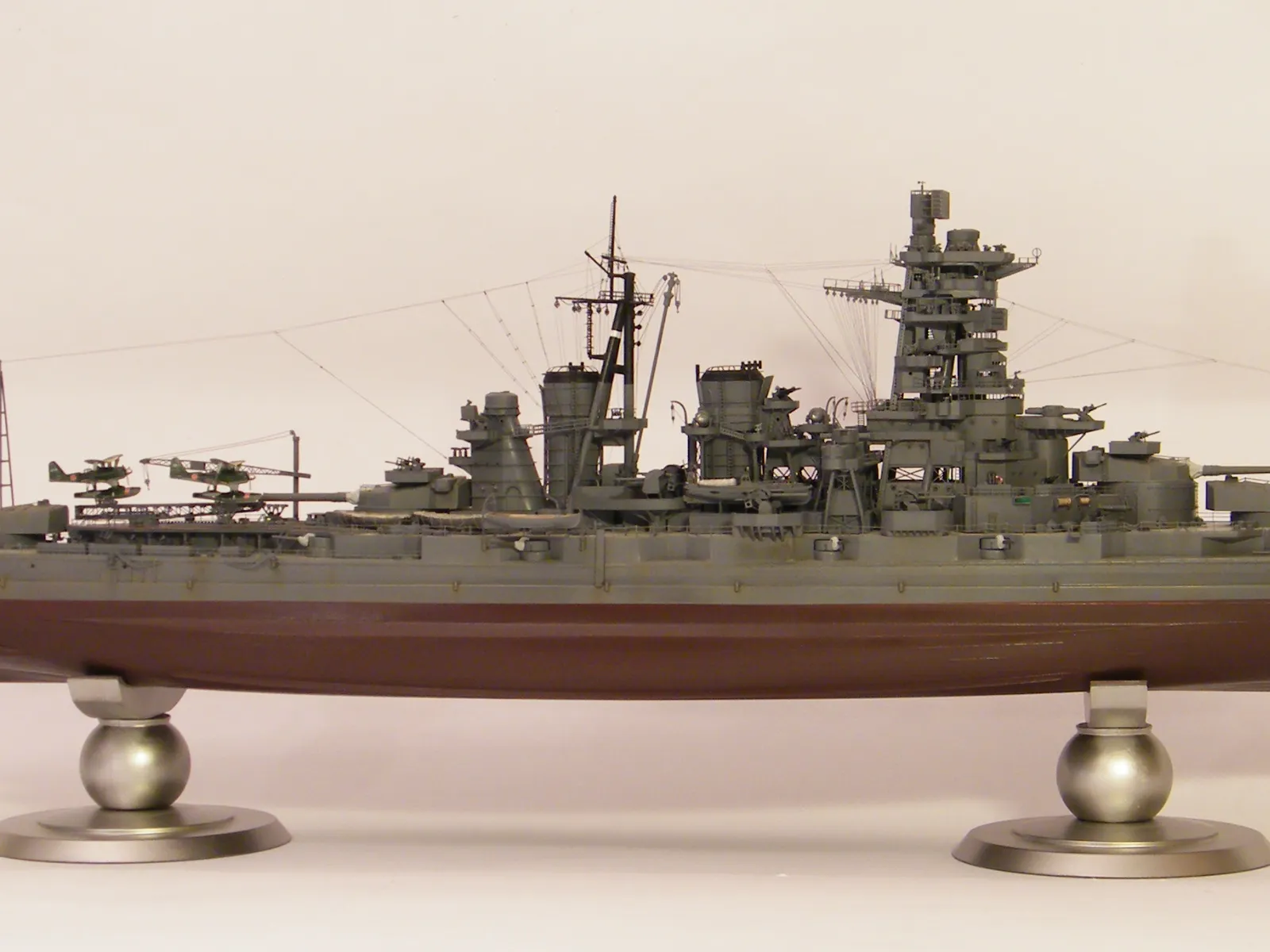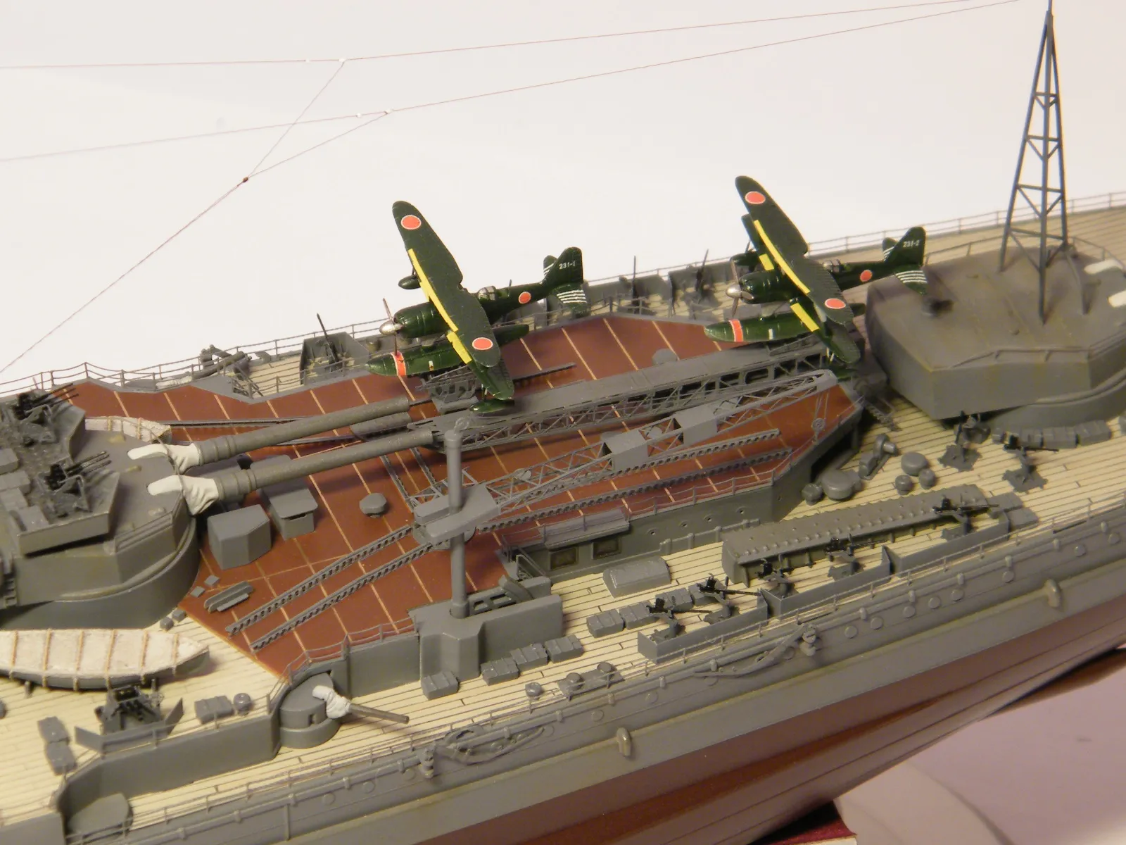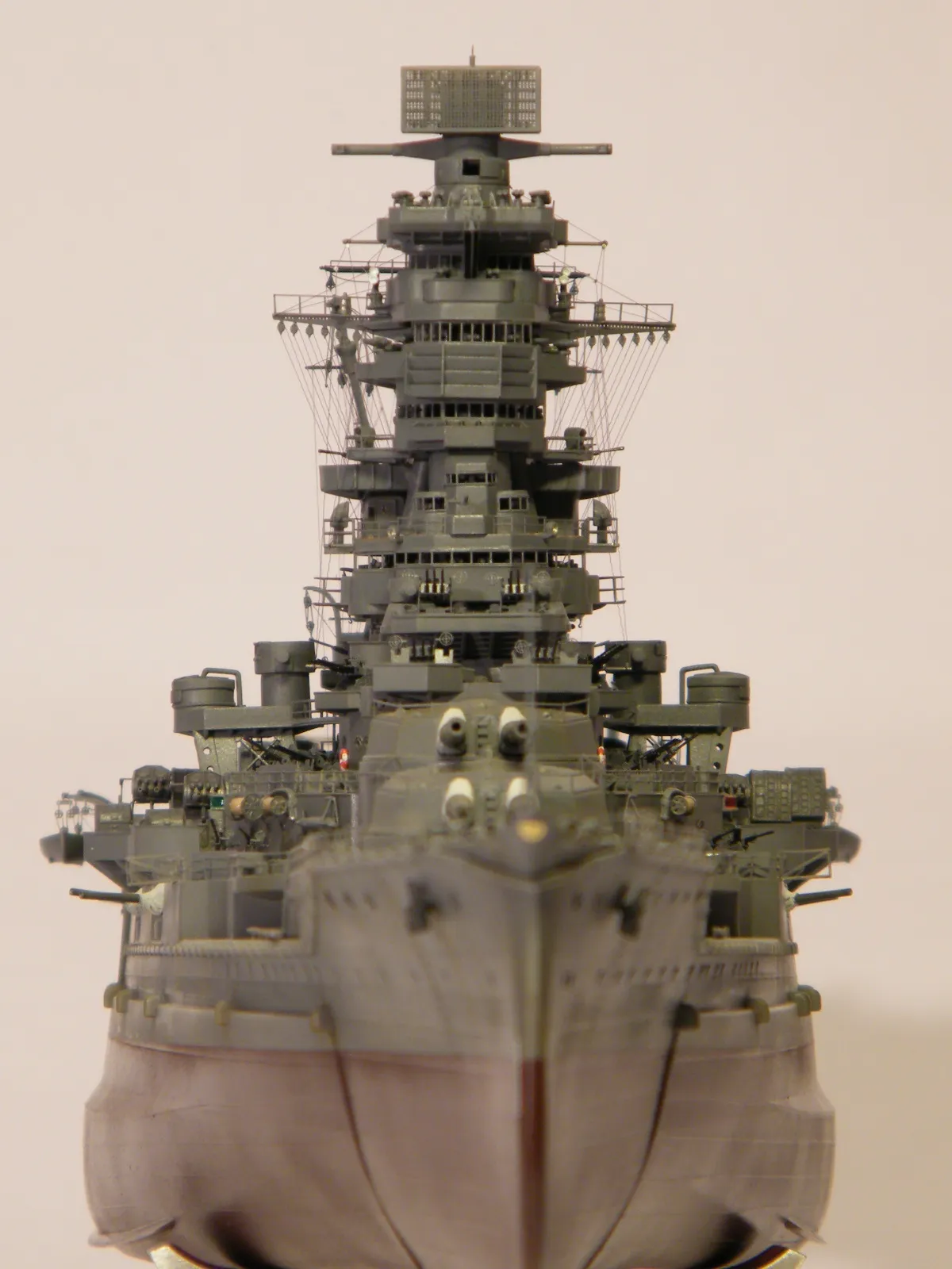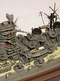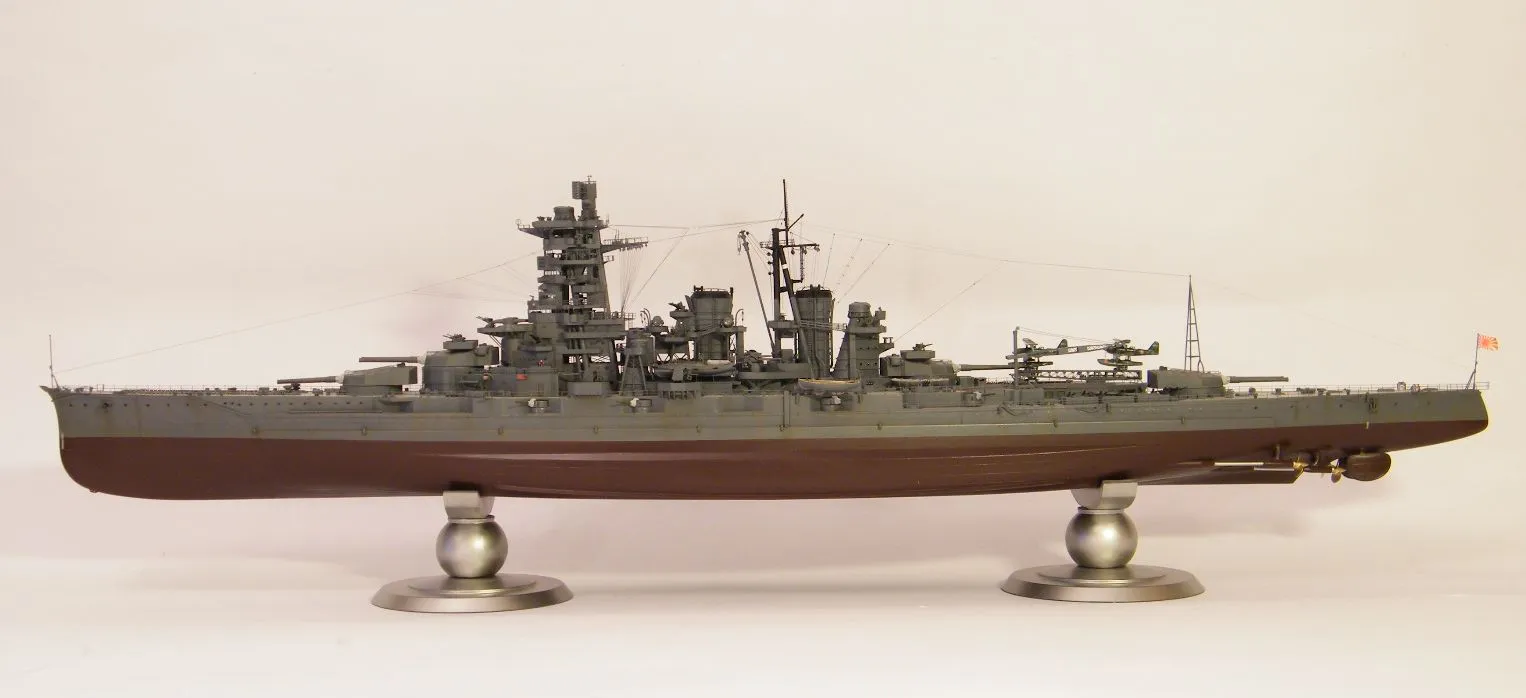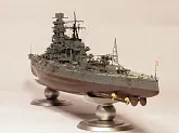 Пластиковая модель фирмы Fujimi, масштаб 1:350. Готовая модель повторяет конфигурацию корабля на момент гибели в 1944-м году. Использовался набор дополнительного травления Fujimi, некоторые пластиковые и травленые элементы других производителей. Часть рангоута, флагшток и гюйсшток заменены на металлические трубочки и стержни. Исправлена форма казематов. Немасштабные установки 127мм зениток заменены на травленые фирмы Voyager, 25мм зенитки заменены на травленку LionRoar. Стволы ГК, 152мм и 127мм - заменены на точеные . Такелаж - нитка от бантика. Окраска акрил Тамии, линейка "IJN" цветов. Попытался изобразить старение окраски - линкор использовался во время войны очень активно, и на момент гибели давно был в море: Корабль был торпедирован на переходе из Брунея в метрополию после катастрофического для японцев сражения в заливе Лейте.