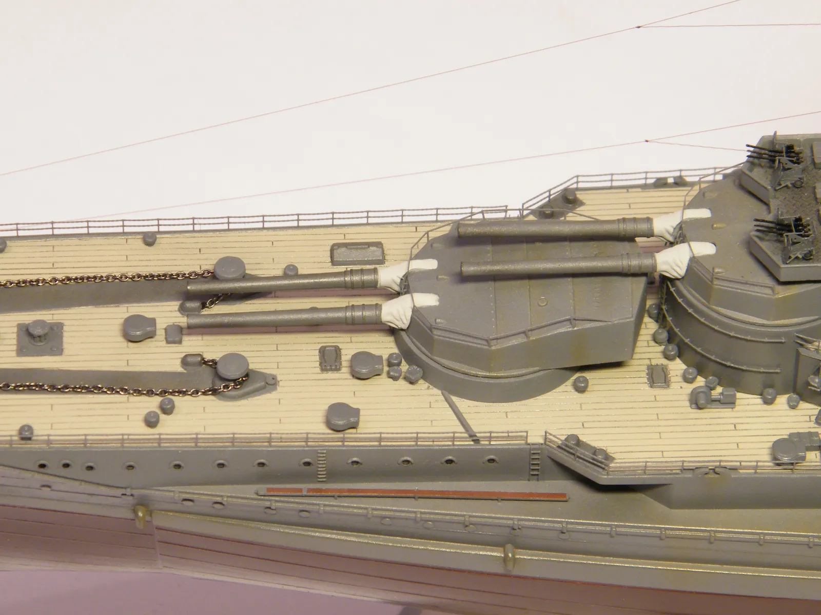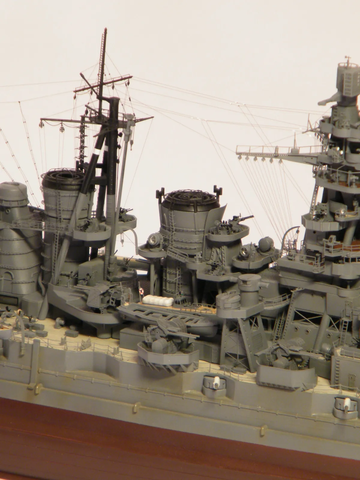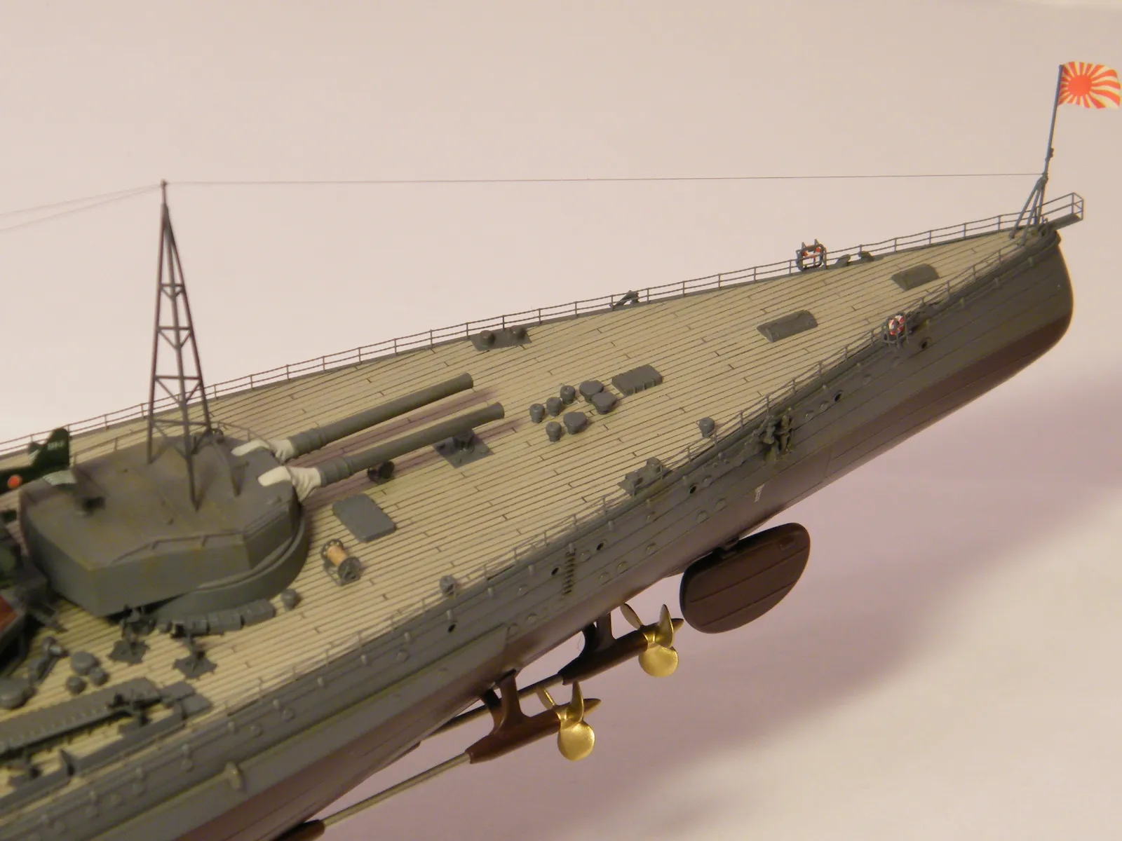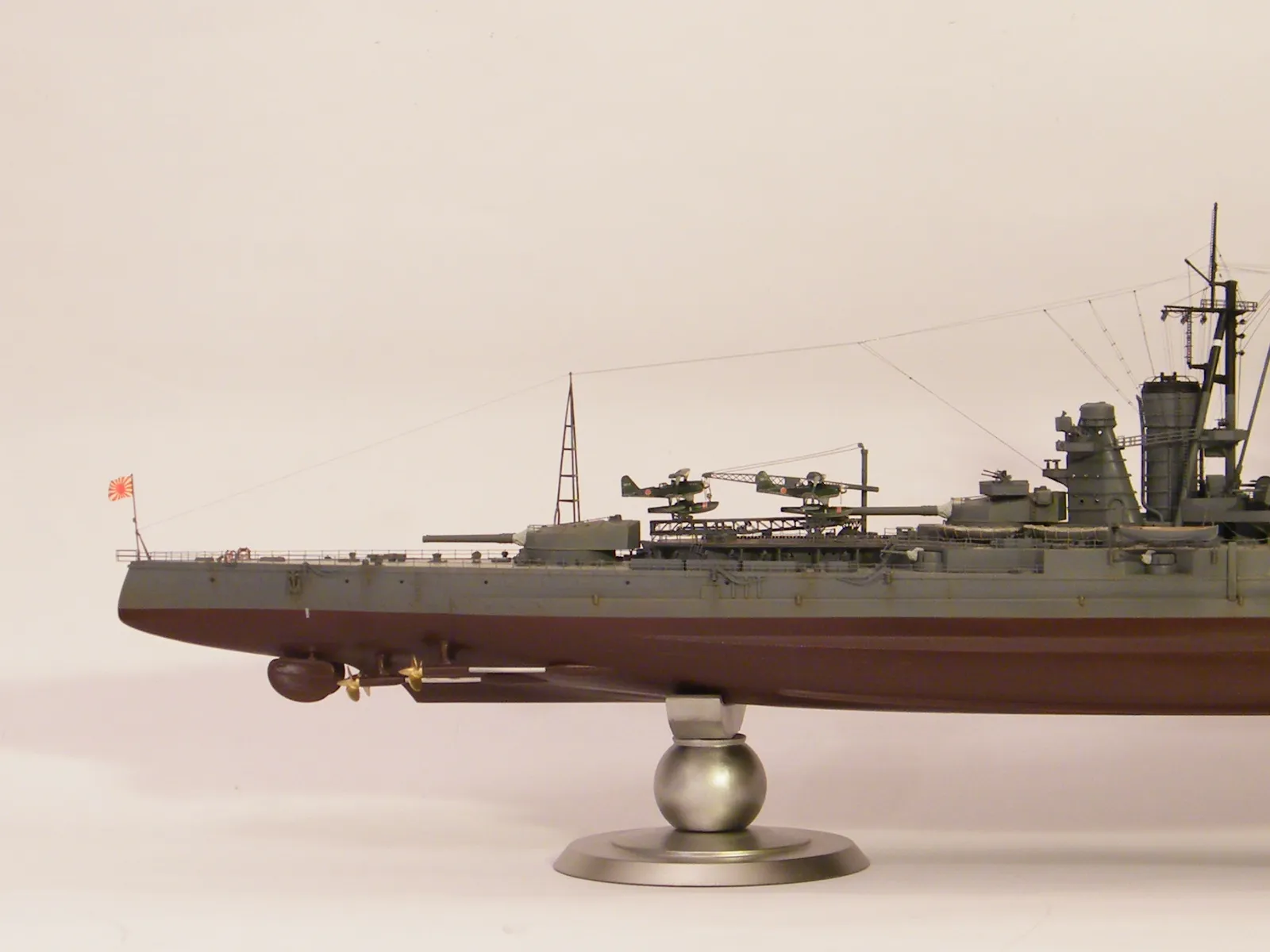 Пластиковая модель фирмы Fujimi, масштаб 1:350. Готовая модель повторяет конфигурацию корабля на момент гибели в 1944-м году. Использовался набор дополнительного травления Fujimi, некоторые пластиковые и травленые элементы других производителей. Часть рангоута, флагшток и гюйсшток заменены на металлические трубочки и стержни. Исправлена форма казематов. Немасштабные установки 127мм зениток заменены на травленые фирмы Voyager, 25мм зенитки заменены на травленку LionRoar. Стволы ГК, 152мм и 127мм - заменены на точеные . Такелаж - нитка от бантика. Окраска акрил Тамии, линейка "IJN" цветов. Попытался изобразить старение окраски - линкор использовался во время войны очень активно, и на момент гибели давно был в море: Корабль был торпедирован на переходе из Брунея в метрополию после катастрофического для японцев сражения в заливе Лейте.