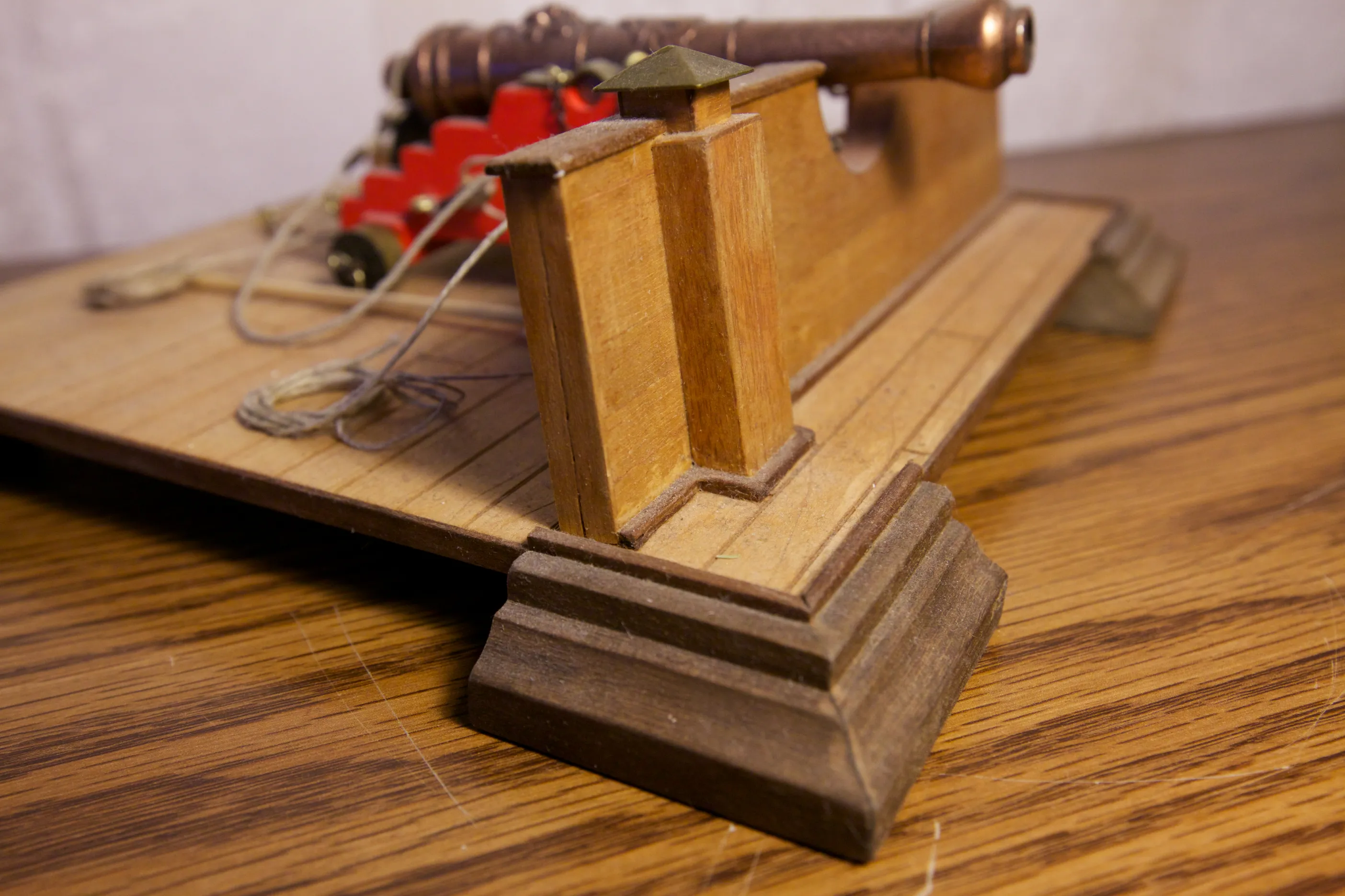 Обшивка фрагмента борта выполнена вразбежку в три доски, Вырез в борту облицован отдельными элементами "как делают бочки", Борт установлен с наклоном - так мне представляется более естественно, чем на фото в наборе. Колеса и элементы "блок-трос" - подвижные. Подъемный клин пушки - подвижный.