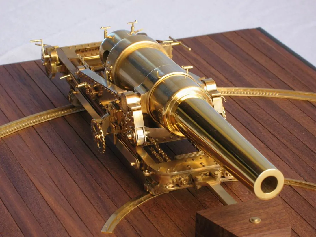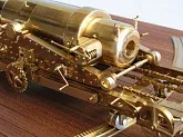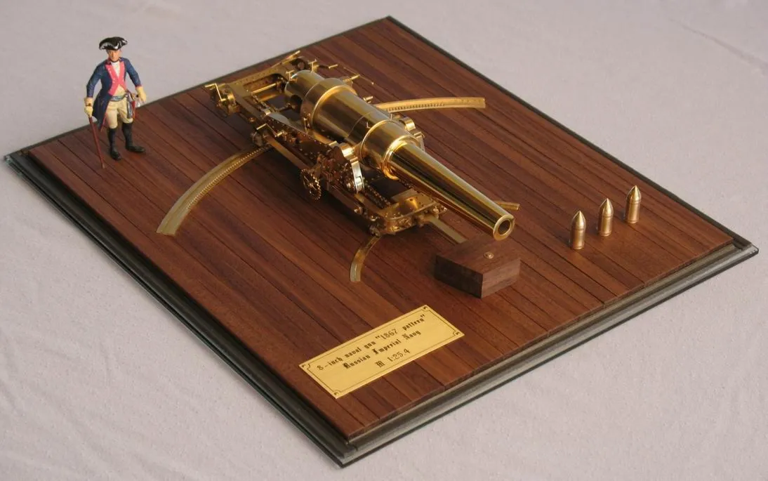 8-дюймовое орудие образца 1867 года на корабельном станке Скотта. Устанавливались на броненосных кораблях и фрегатах русского флота. Модель из латуни, частично с покрытием из серебра или меди. Все детали изготовлены самостоятельно по чертежам из журнала "Морской сборник" 18хх года, а также по книгам для артиллеристов и инженеров 19 века. Конструкция, по-возможности, сохранена оригинальной - практически отсутсвует пайка, только клепка (1-0.5мм) и болты(М1.2 М1 М0.8). Фигура человека - покупная и не соответствует эпохе, но изготовлена в том же масштабе 1:25.