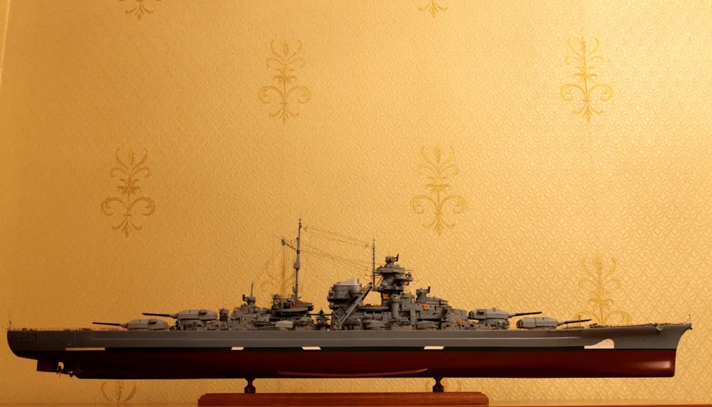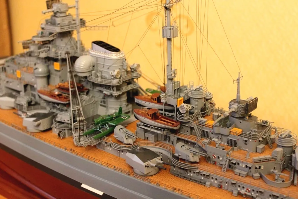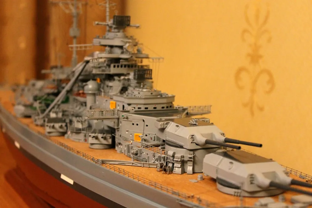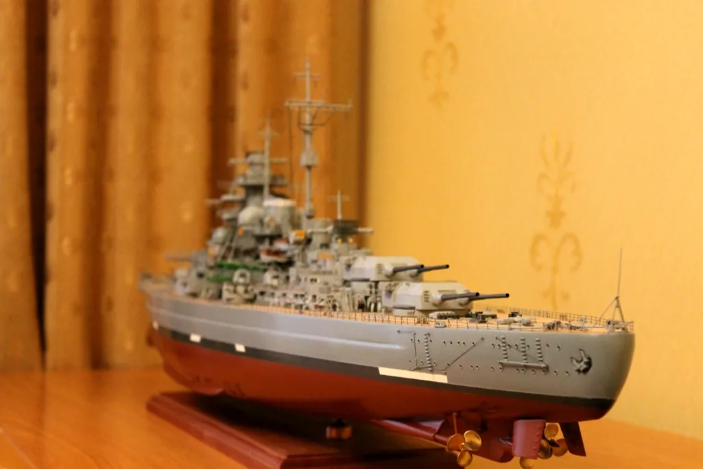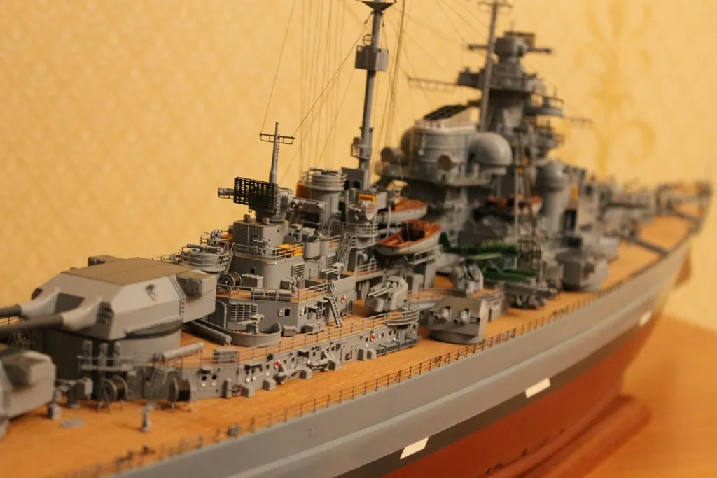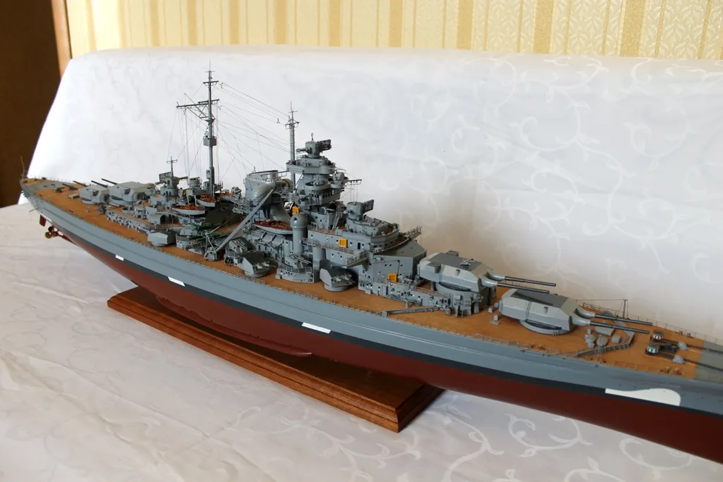 Проект модели линкора «Бисмарк» выполнен в масштабе 1:200, итальянской фирмой Amati на основе оригинальных чертежей, в мельчайших подробностях и с высоким уровнем достоверности каждого элемента. Размеры: длина 1250 мм; ширина 180 мм;