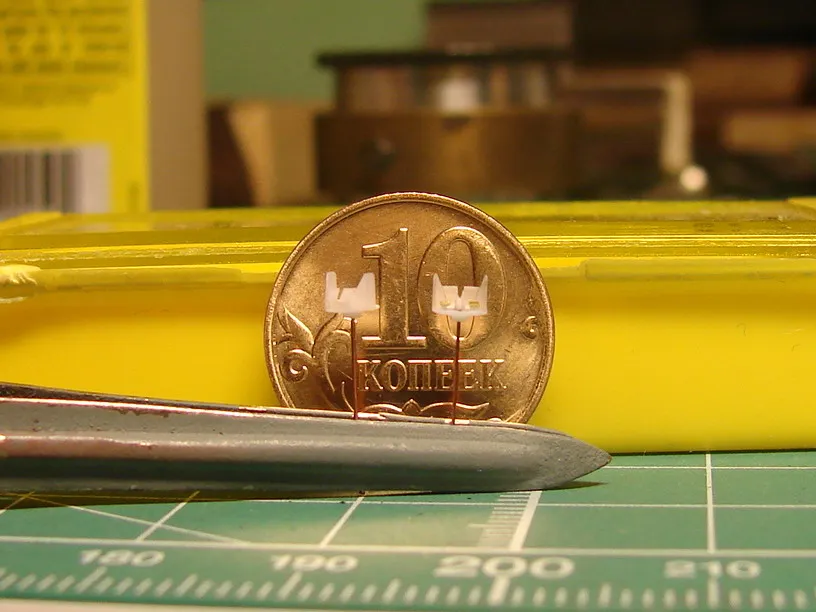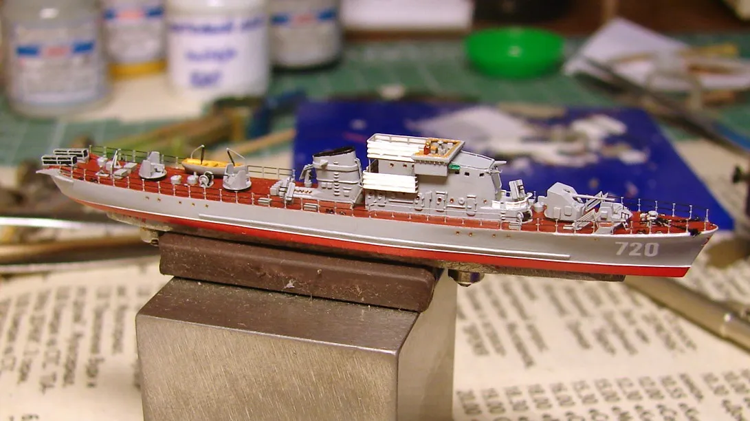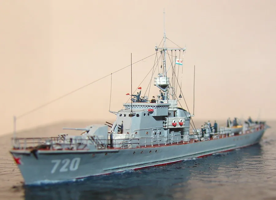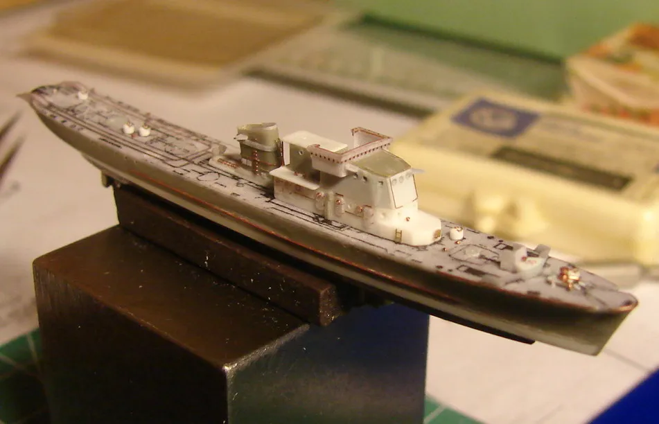 Модель построена в масштабе 1/700 практически "с нуля". За основу был взят набор от фирмы Комбриг, но так как все детали в наборе были "кривые" или с браком, проще было всё сделать самостоятельно. Модель строилась по чертежам и фотографиям из двух монографий посвящённых кораблям этого проекта и материалам из Интернета . Из набора взяты только три детали, которые более-менее можно было использовать в постройке модели: корпус, ходовая рубка, дымовая труба /на фотографиях процесса постройки они выглядят серо-зелёными/. Так как корпус тонкий и длинный, его повело «бананом». Для выравнивания, к нижней части корпуса было прикреплено металлическое ребро жесткости на двух винтиках с гайками. Вся остальная деталировка изготавливалась самостоятельно из пластика, проволоки, элементов разных фототравленых деталей и пропитанной супер-клеем бумаги. Такелаж изготовлен из тянутого литника и тонкой капроновой нити 0.03мм. Из фабричных деталей использовалось фототравление от GMM и WEM: леера, трапы, вьюшки, фигурки моряков. Бортовые номера, эмблема и флаги сделаны из декалей подходящего размера. Модель окрашены кистью водно-растворимыми красками АКАН. Модель из общей диорамы "Корабли Ленинградской ВМБ на учениях"