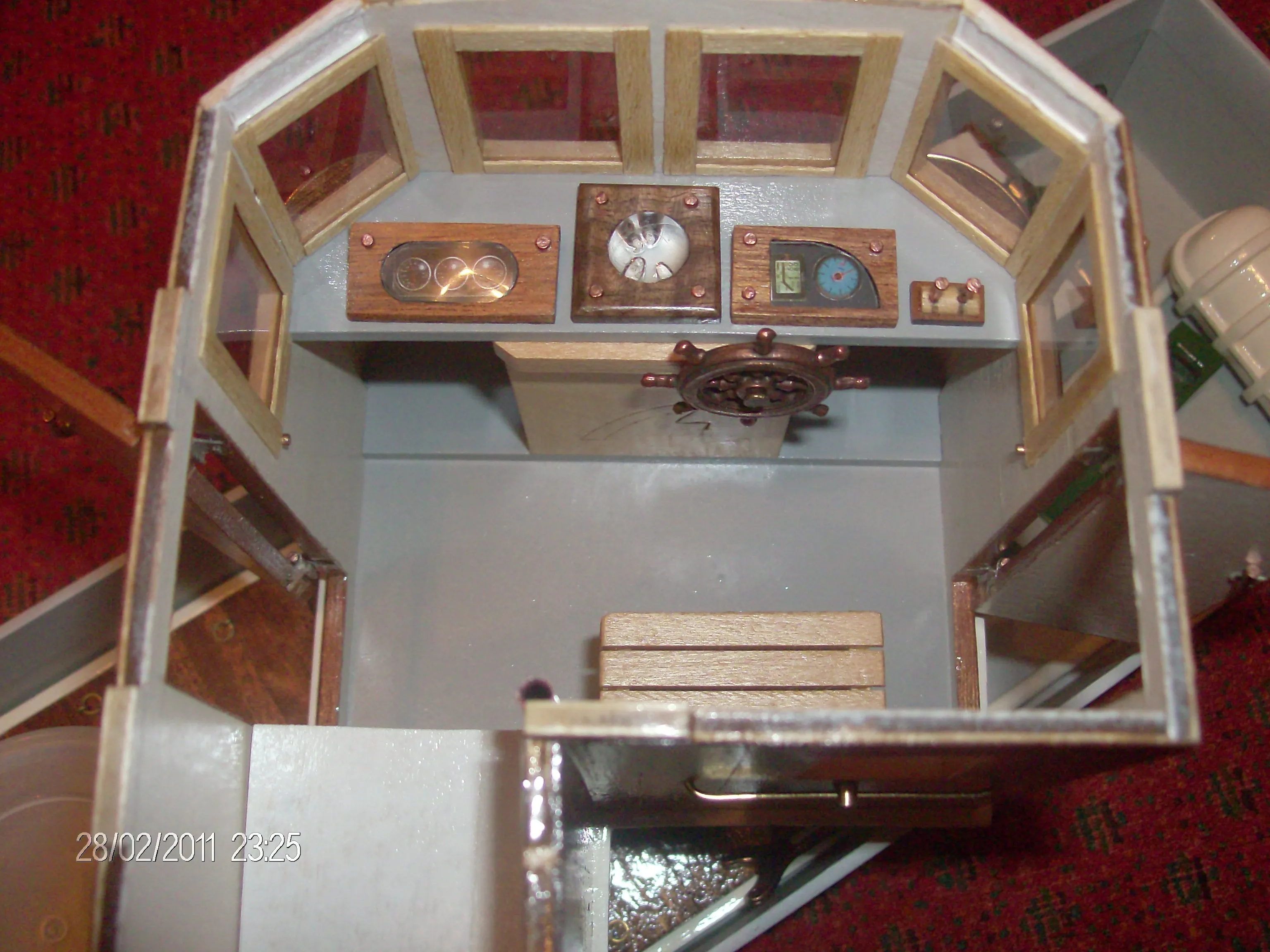 - сделать открывающиеся двери в рубке, минимальный внутренний интерьер рубки ( скамейку, приборы, т.к. в наборе предлагалось только укрепить штурвал);