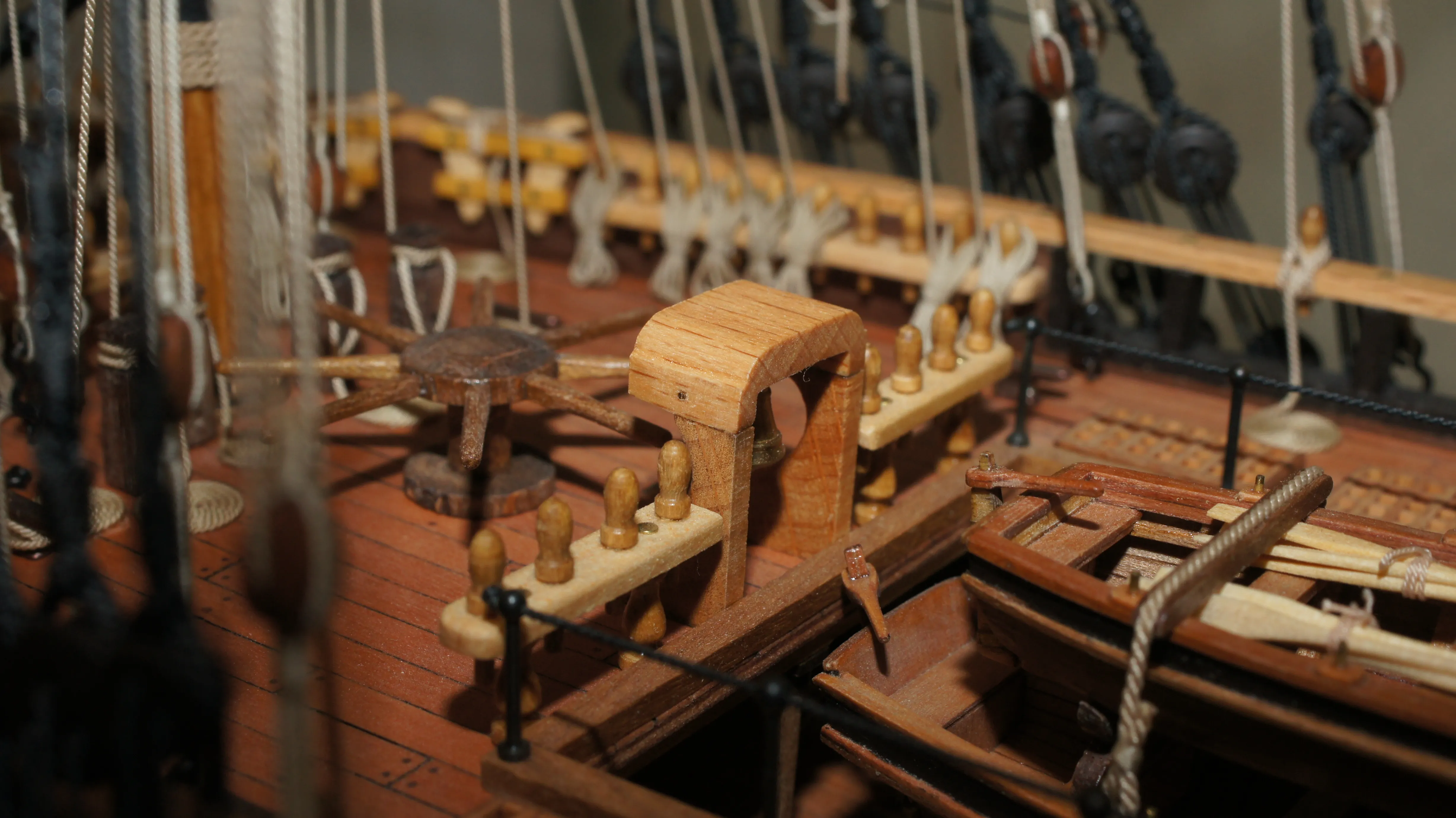 Модель фирмы COREL изготовлена в масштабе 1:75, длина 840мм, высота 705 мм, ширина 290 мм. Набор постигли глобальные переделки. В первую очередь прорезал нижнюю палубу. Потом довёл до ума пушки: сделал пушечные и откатные тали, противооткатный брюк, оковал железом колёса. В палубном настиле каждая точка – деревянный гвоздь. Добавил к набору шлюпки и кормовые фонари. Нижняя шлюпка – покупной набор, верхняя с вёслами - собственное творчество. Заменил все блоки , эзельгофты и нитки на кручёные канаты. К якорям добавил томбуи. В конце повесил новые флаги и вымпелы приобретённые на сайте «IMHOBBY.ru». Используемая литература: О.Курти «Постройка моделей судов», К.Х.Марквардт «Рангоут, такелаж и паруса судов XVIII века».