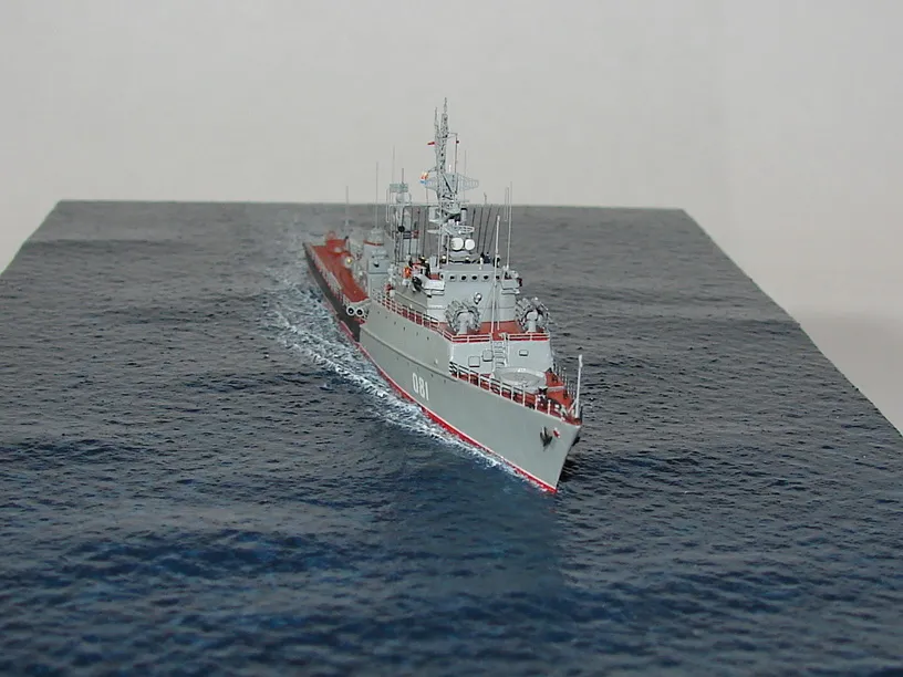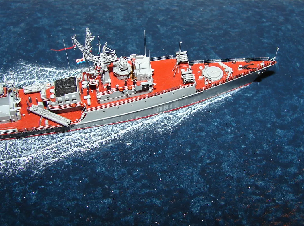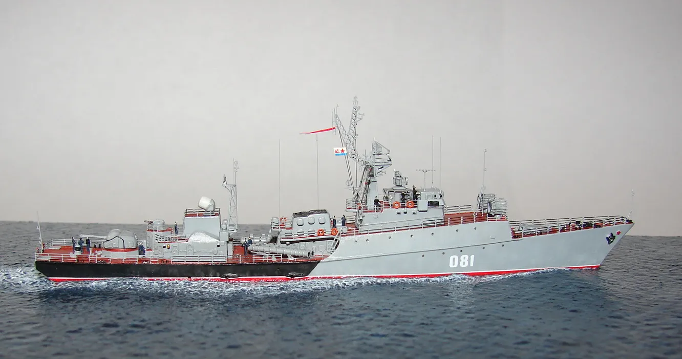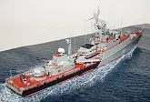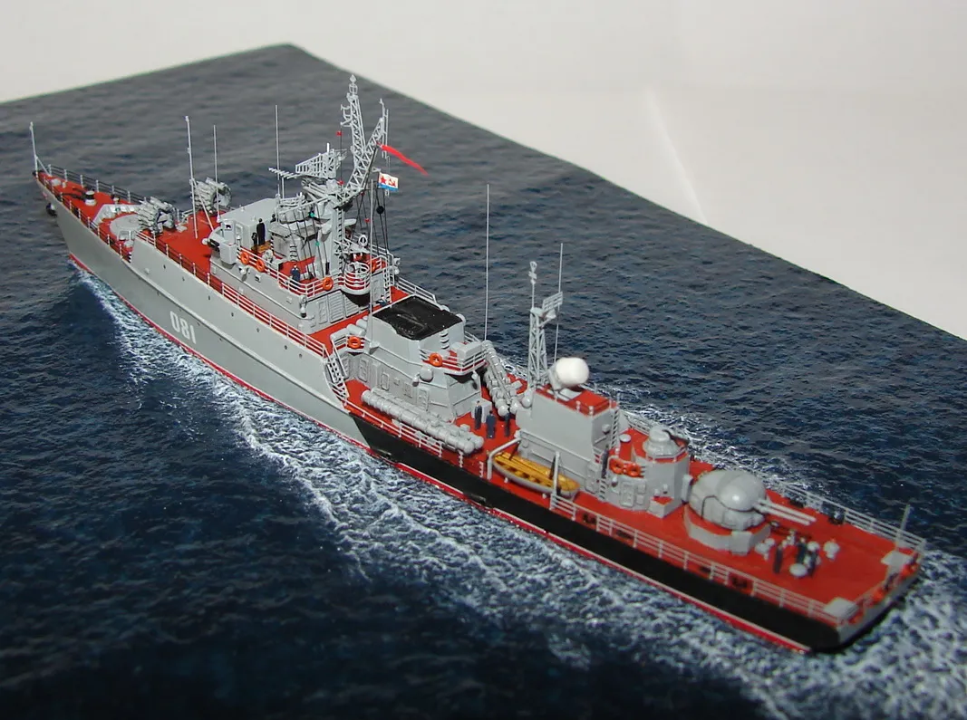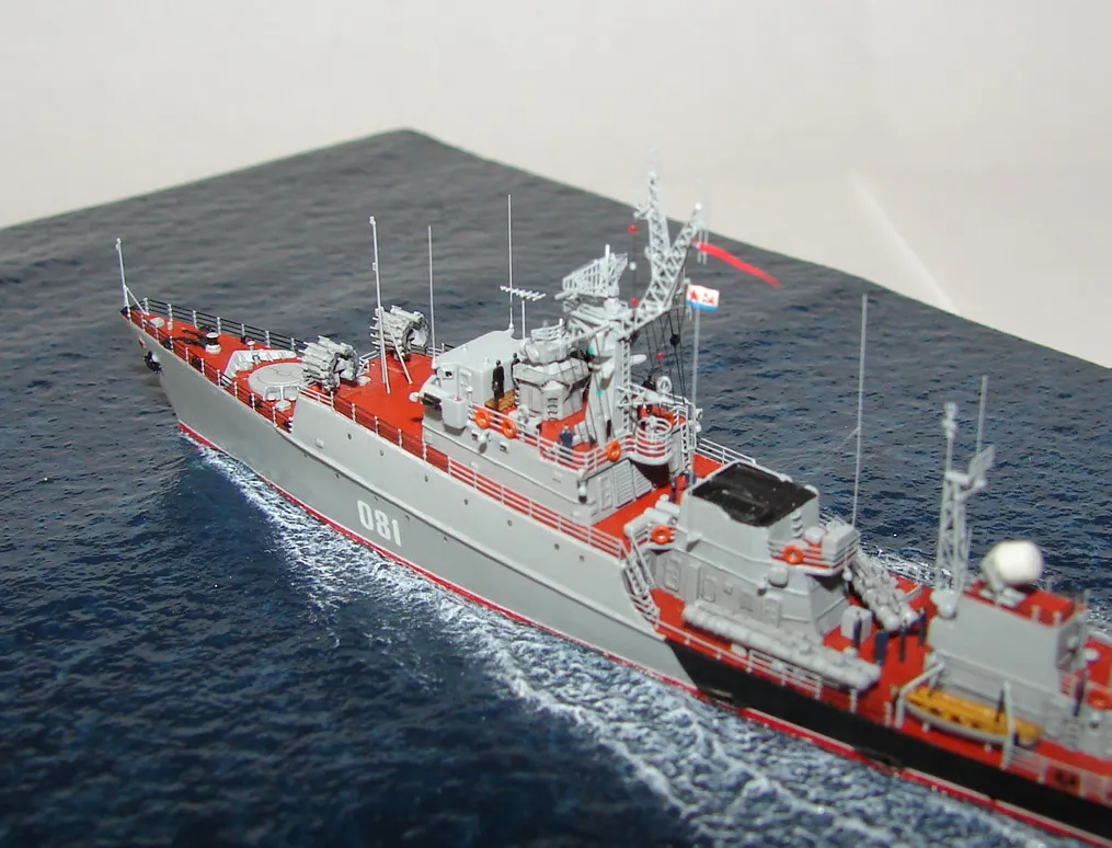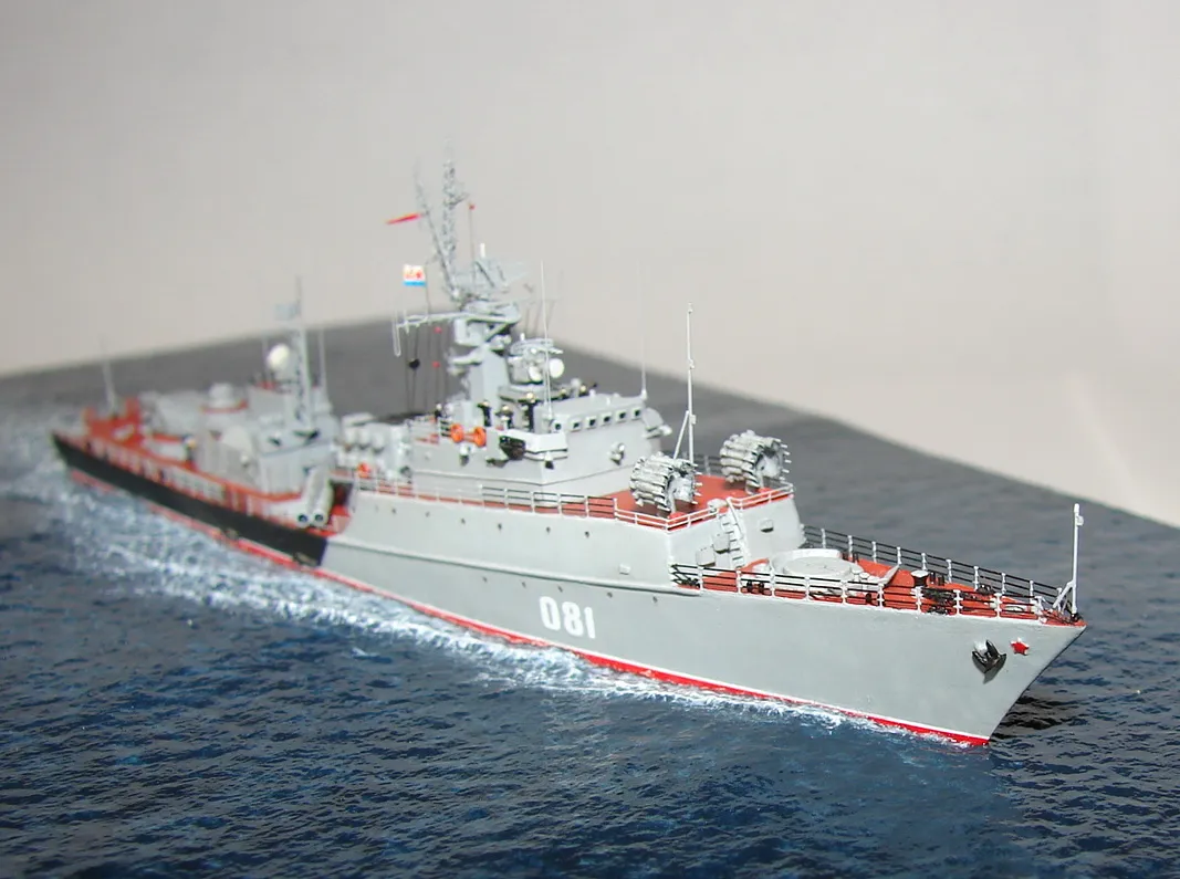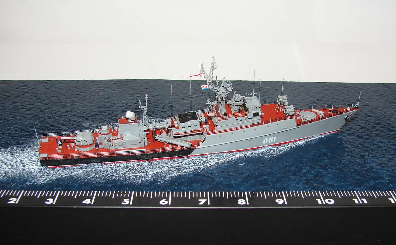 Данная модель изготовлена в масштабе 1/700, по технологии "самодел/набор". За основу был взят набор комбриговской модели "МПК-44". Из самого набора использовались только несколько деталей, которые подверглись исправлению и доработке по чертежам и фотографиям - это корпус, дымовая труба, первый ярус надстройки на спардеке и ходовая рубка, шлюпка, пирамидальная колонна мачты, башня АК-725, тумба под РЛС ЗРК "Оса". Кормовая надстройка и кожух дымовой трубы изготовлены самостоятельно. Единственные детали от набора, которых не коснулась доработка и исправление - это киповые планки. Они только были срезаны со своих мест на палубе, во время работ по исправлению и выравниванию корпуса. Некоторые детали были использованы в виде "клонов", скопированы и отлиты по технологии "resin kit" - это башенка "АК-630", РЛС "Вымпел" и двери. Некоторые детали были сделаны из отдельных элементов фототравления, не относящихся к данной модели, например, ажурная часть мачты без кронштейнов и антенн, собрана из тринадцати (13) отдельных элементов от разных фототравеных деталей, небольшая мачта на кормовой надстройке собрана из трёх (3) элементов. Вообще, в природе существует только несколько наборов фототравленых деталей для моделей современных кораблей отечественного флота в масштабе 1/700, так что, при постройке какой нибудь модели всегда приходится импровизировать из имеющегося. Из стандартных фототравленых деталей были использованы: леера, трапы, двери, рамы прямоугольных иллюминаторов, эмблемы-звёзды на носе корпуса, всевозможные антеннки и локаторы, фигурки человечков. Бортовые номера, герб на корме и флаг сделаны из фабричной детали подходящего размера. Вымпел изготовлен самостоятельно из кусочка детали. Остальная деталировка была сделана полностью самостоятельно из пластика, проволоки, пропитанной супер-клеем бумаги. Например, одна торпедная установка, вместе с палубными деталями для неё, состоит из сорока (40) отдельно изготовленных элементов, один ствол от АК-725 собран из семи (7) деталей (ствол, три кронштейна, две трубки и шланг охлаждения), одна установка "РБУ-6000" собрана из сорока двух (42) отдельных деталей, крышка ПУ ЗРК "Оса" со всей деталировкой собрана из одиннадцати (11) деталей, РЛС ЗРК "Оса" собрана из пятидесяти семи (57) отдельно сделанных элементов и деталей. Модель окрашена кистью, водорастворимыми красками АКАН. При работе над моделью использовались чертежи фирмы GMS Model Building, книга Костриченко В.В. "Альбатрос"- Дозорный в море и материалы из сети Интернет. Модель делалась по единственной и не очень крупной фотографии самого корабля, на интересующий меня период - середина 1980 гг. К сожалению, но других фотографий корабля того времени, мне не удалось найти и приходилось пользоваться фотографиями других кораблей этого типа в тот период службы. На модели есть некоторые неточности и "косяки", связанные с особенностями масштаба и некоторыми элементами фототравления, но в общем, это не сильно заметно и не сильно влияет на общую картину.