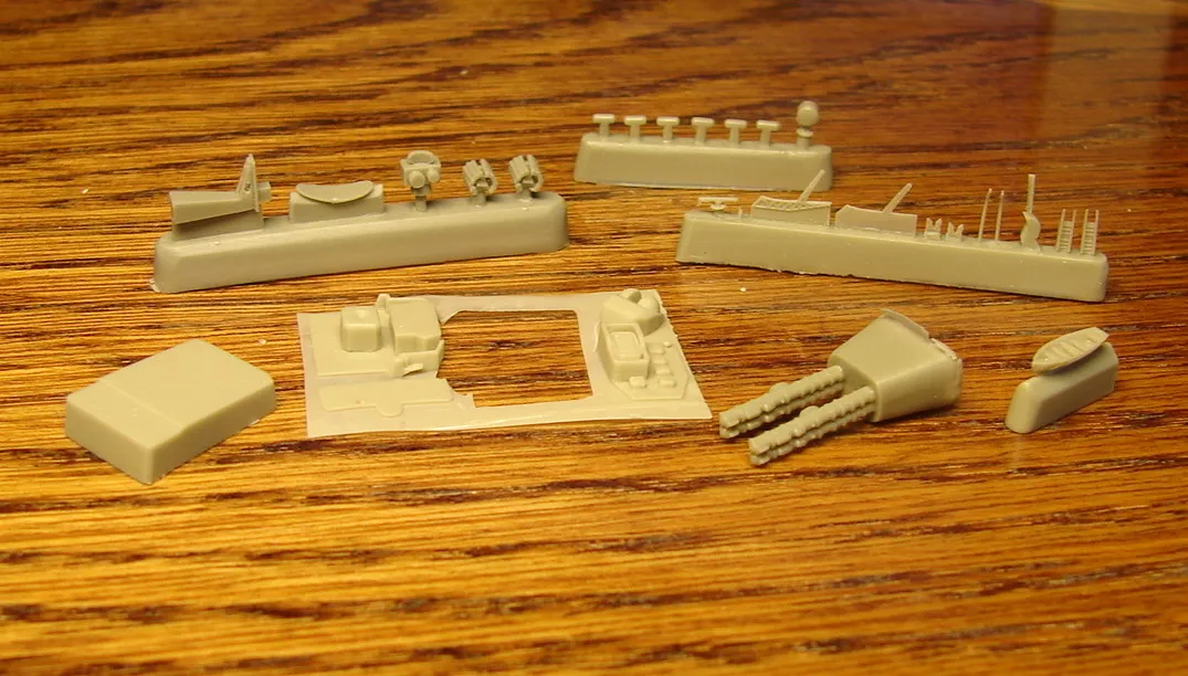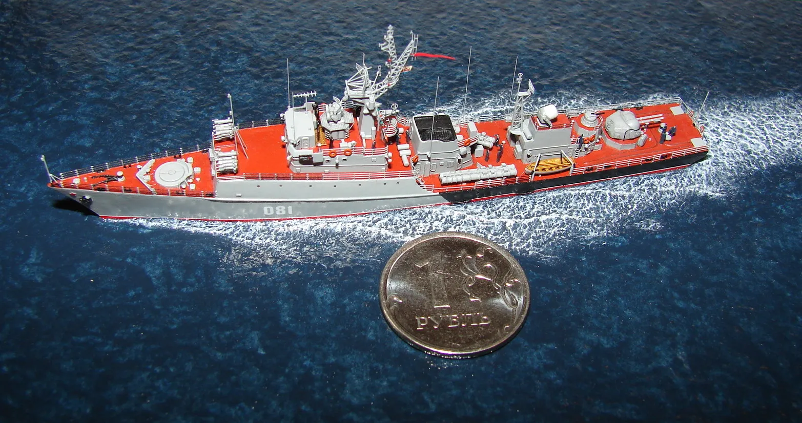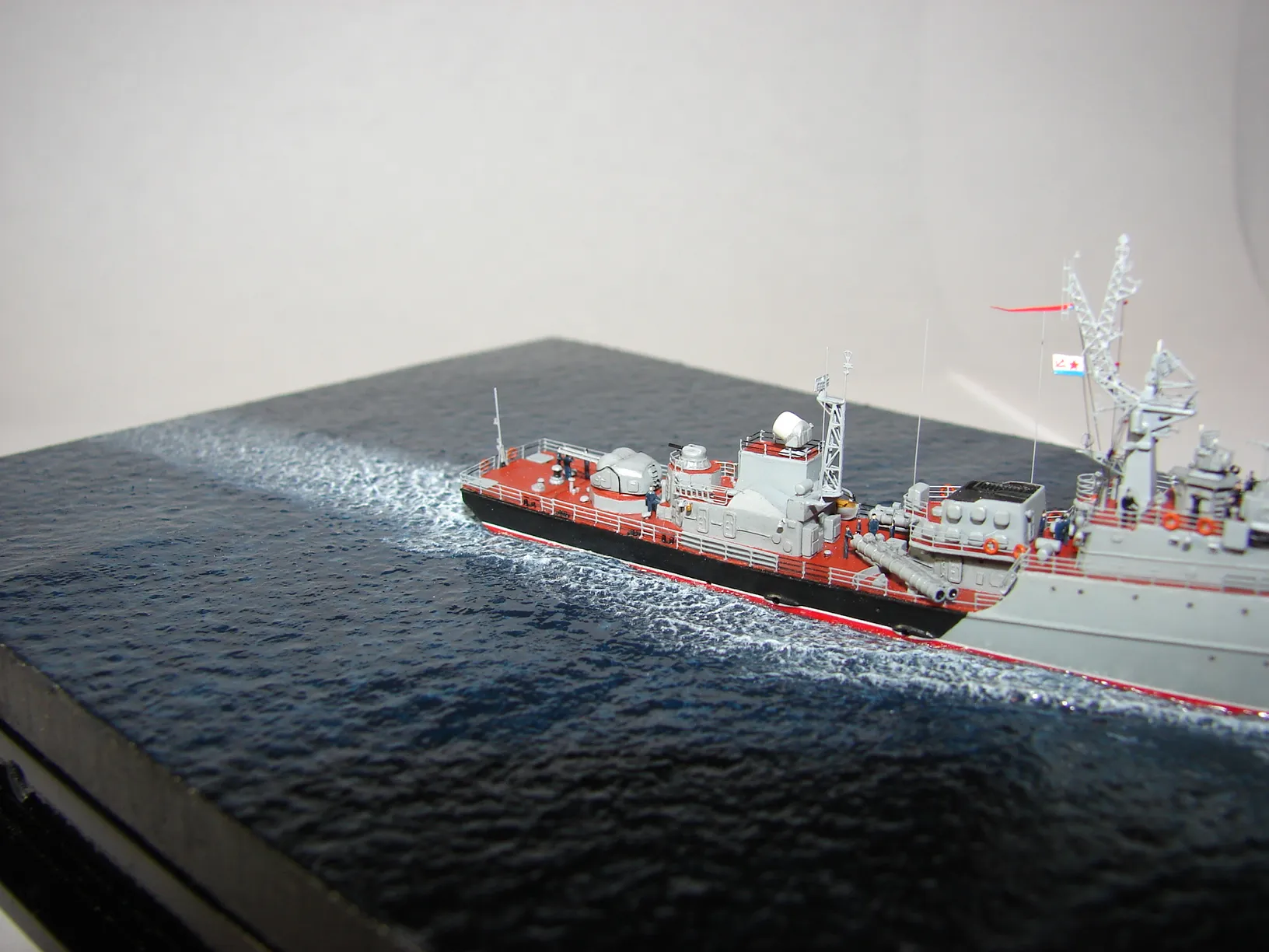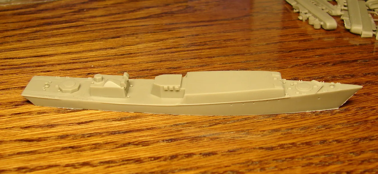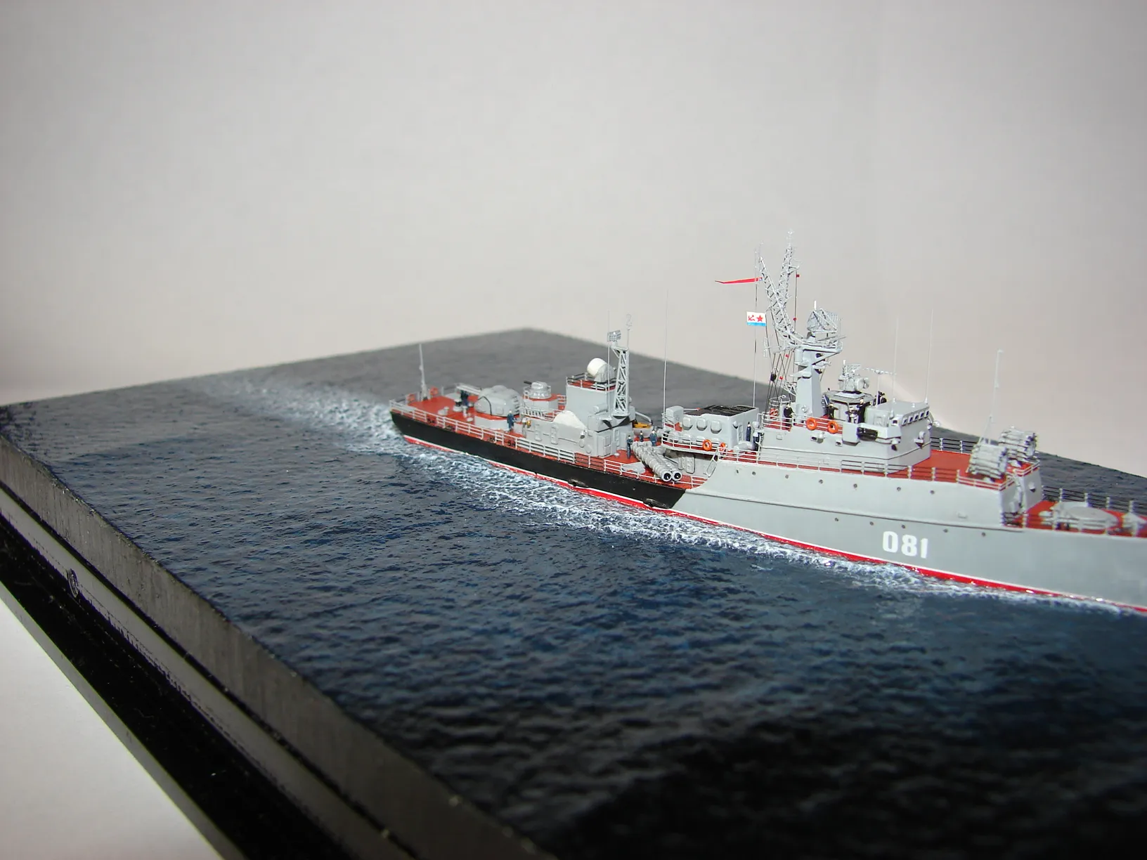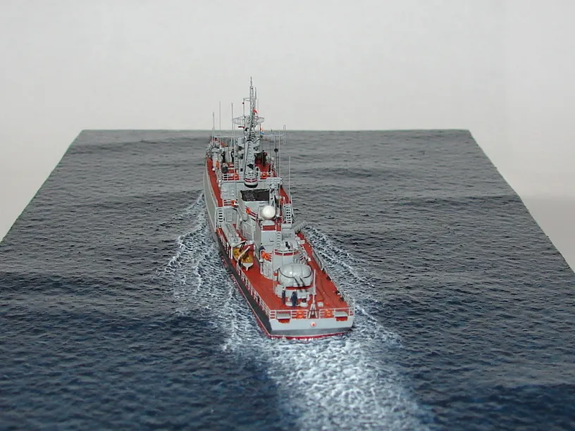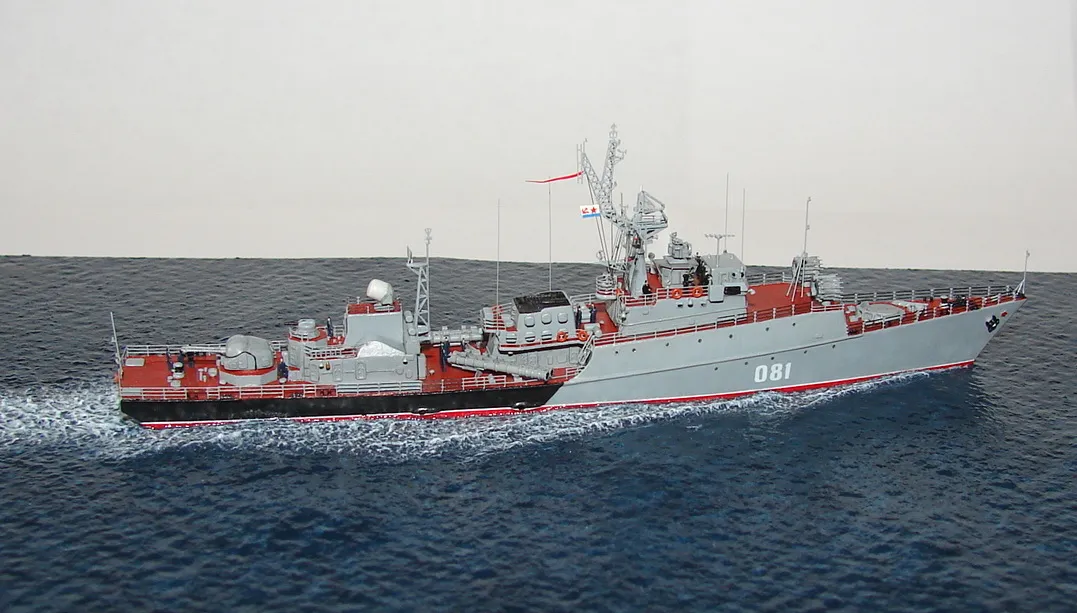 Данная модель изготовлена в масштабе 1/700, по технологии "самодел/набор". За основу был взят набор комбриговской модели "МПК-44". Из самого набора использовались только несколько деталей, которые подверглись исправлению и доработке по чертежам и фотографиям - это корпус, дымовая труба, первый ярус надстройки на спардеке и ходовая рубка, шлюпка, пирамидальная колонна мачты, башня АК-725, тумба под РЛС ЗРК "Оса". Кормовая надстройка и кожух дымовой трубы изготовлены самостоятельно. Единственные детали от набора, которых не коснулась доработка и исправление - это киповые планки. Они только были срезаны со своих мест на палубе, во время работ по исправлению и выравниванию корпуса. Некоторые детали были использованы в виде "клонов", скопированы и отлиты по технологии "resin kit" - это башенка "АК-630", РЛС "Вымпел" и двери. Некоторые детали были сделаны из отдельных элементов фототравления, не относящихся к данной модели, например, ажурная часть мачты без кронштейнов и антенн, собрана из тринадцати (13) отдельных элементов от разных фототравеных деталей, небольшая мачта на кормовой надстройке собрана из трёх (3) элементов. Вообще, в природе существует только несколько наборов фототравленых деталей для моделей современных кораблей отечественного флота в масштабе 1/700, так что, при постройке какой нибудь модели всегда приходится импровизировать из имеющегося. Из стандартных фототравленых деталей были использованы: леера, трапы, двери, рамы прямоугольных иллюминаторов, эмблемы-звёзды на носе корпуса, всевозможные антеннки и локаторы, фигурки человечков. Бортовые номера, герб на корме и флаг сделаны из фабричной детали подходящего размера. Вымпел изготовлен самостоятельно из кусочка детали. Остальная деталировка была сделана полностью самостоятельно из пластика, проволоки, пропитанной супер-клеем бумаги. Например, одна торпедная установка, вместе с палубными деталями для неё, состоит из сорока (40) отдельно изготовленных элементов, один ствол от АК-725 собран из семи (7) деталей (ствол, три кронштейна, две трубки и шланг охлаждения), одна установка "РБУ-6000" собрана из сорока двух (42) отдельных деталей, крышка ПУ ЗРК "Оса" со всей деталировкой собрана из одиннадцати (11) деталей, РЛС ЗРК "Оса" собрана из пятидесяти семи (57) отдельно сделанных элементов и деталей. Модель окрашена кистью, водорастворимыми красками АКАН. При работе над моделью использовались чертежи фирмы GMS Model Building, книга Костриченко В.В. "Альбатрос"- Дозорный в море и материалы из сети Интернет. Модель делалась по единственной и не очень крупной фотографии самого корабля, на интересующий меня период - середина 1980 гг. К сожалению, но других фотографий корабля того времени, мне не удалось найти и приходилось пользоваться фотографиями других кораблей этого типа в тот период службы. На модели есть некоторые неточности и "косяки", связанные с особенностями масштаба и некоторыми элементами фототравления, но в общем, это не сильно заметно и не сильно влияет на общую картину.