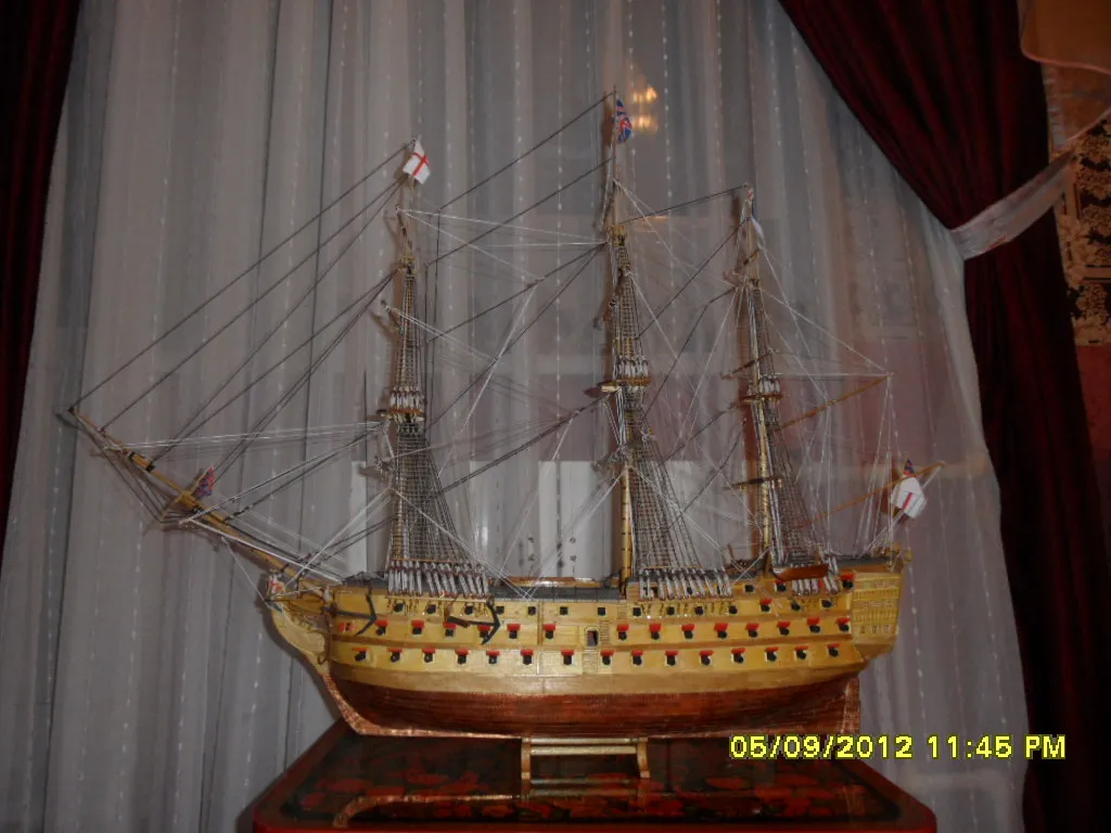 Модель построена полностью с нуля. При изготовлении использовал чертежи бумажной модели. Для постройки пользовался только ручным инструментом (кроме дрели). Из материалов использовал в основном фанеру 4 мм. Пушки выточены из дерева, днище обшито медью. Это моя первая модель, делал ее два года.