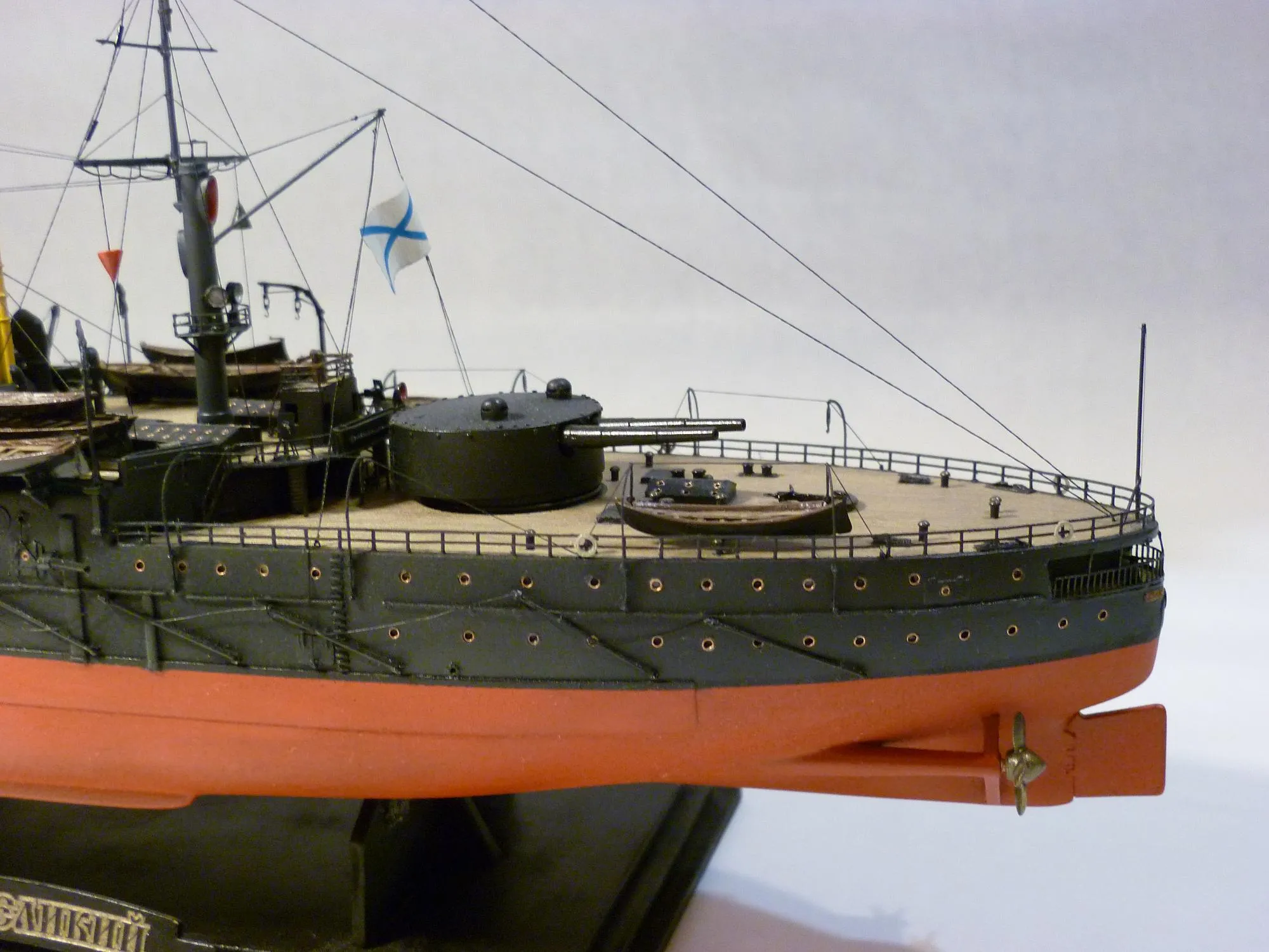 Модель создавалась на период осени 1904 г. в момент отплытия 2 Тихоокеанской эскадры к театру военных действий на дальний восток. Выполнена модель из коробки с авторскими доработками по чертежам г.А.Логинова и фотографиям оригинала.