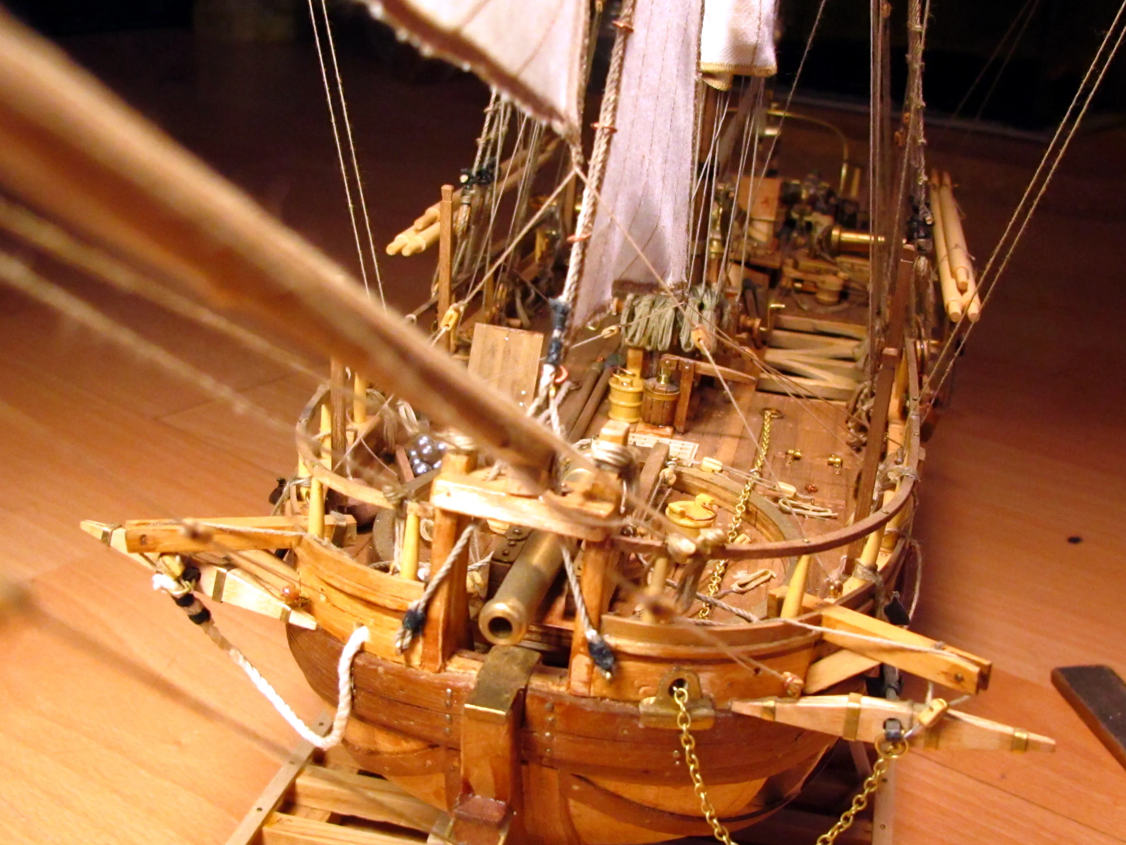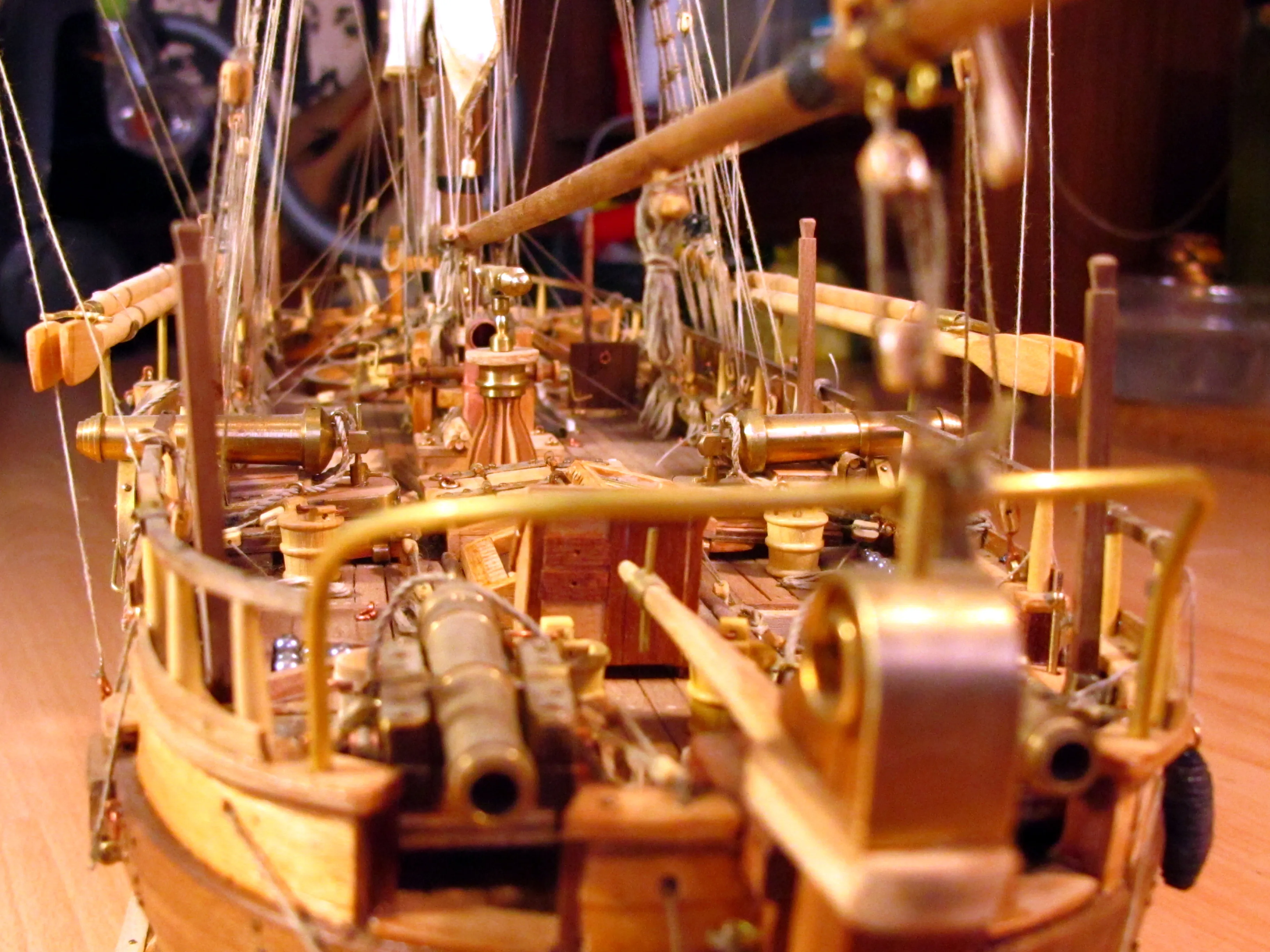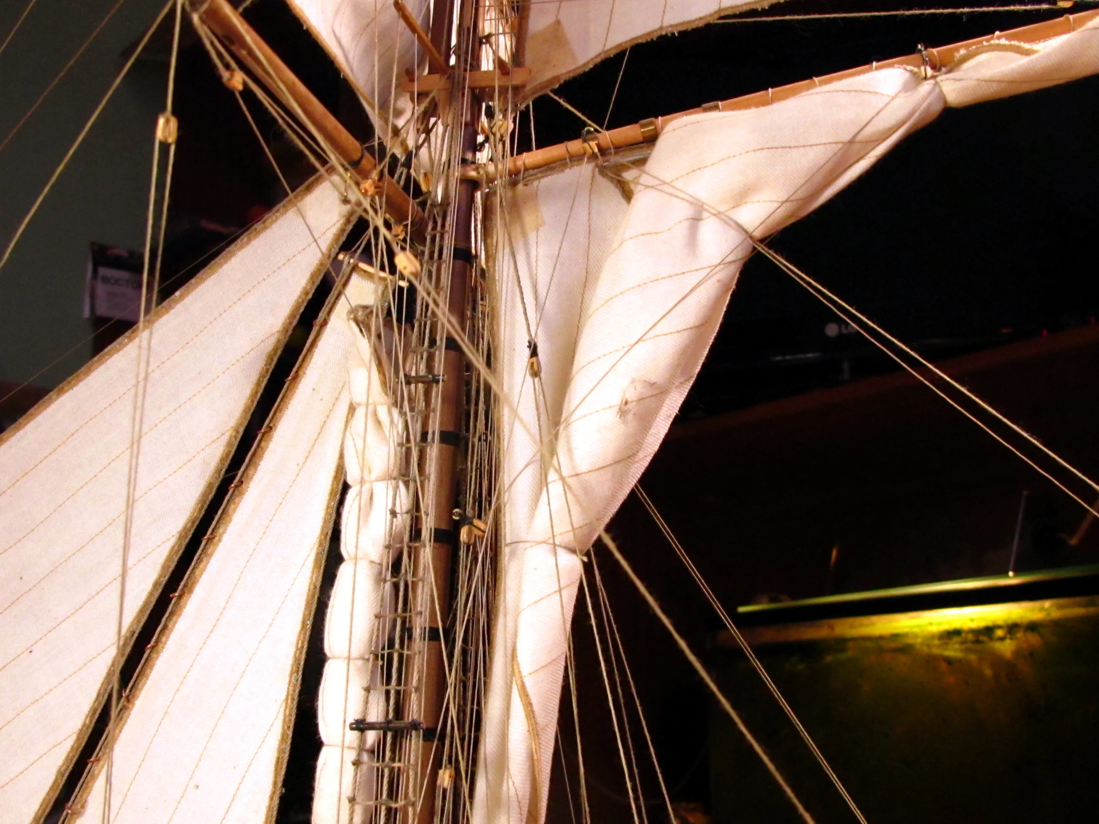 Паруса покупные, из вашего магазина. Немного модернизировал (усилил углы, обшил). При проводке такелажа трудностей не возникло. Чертежи достаточно подробные.