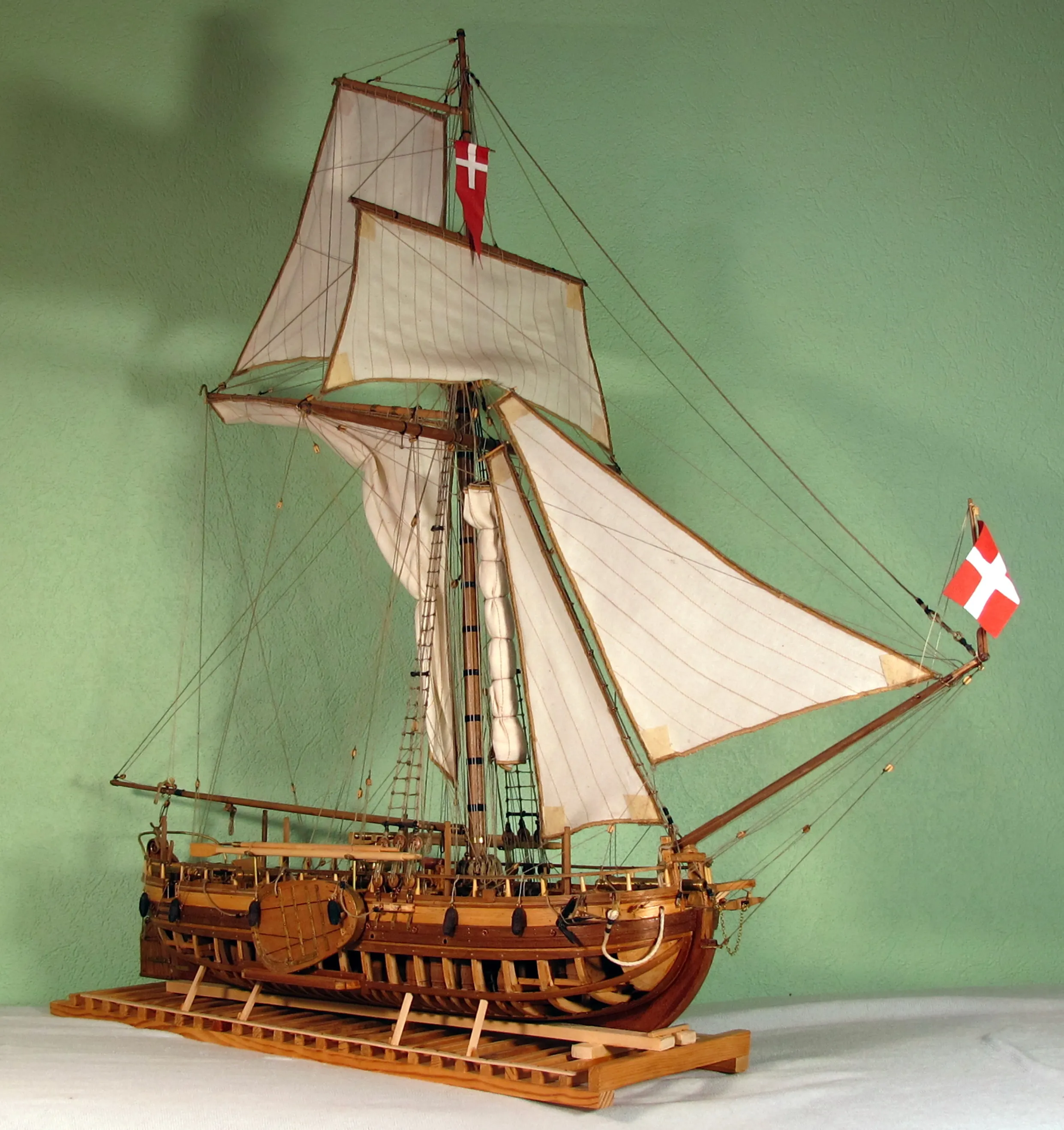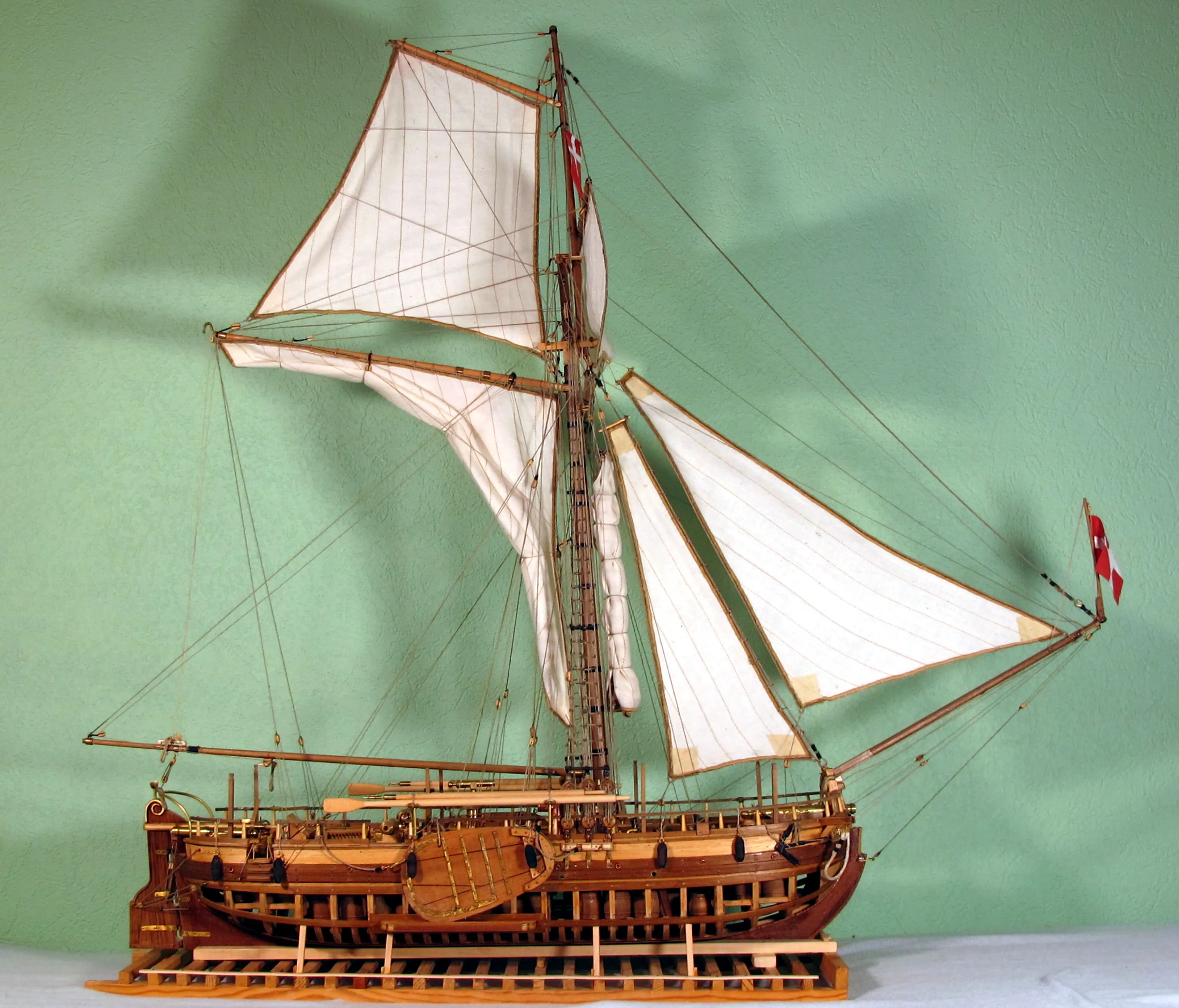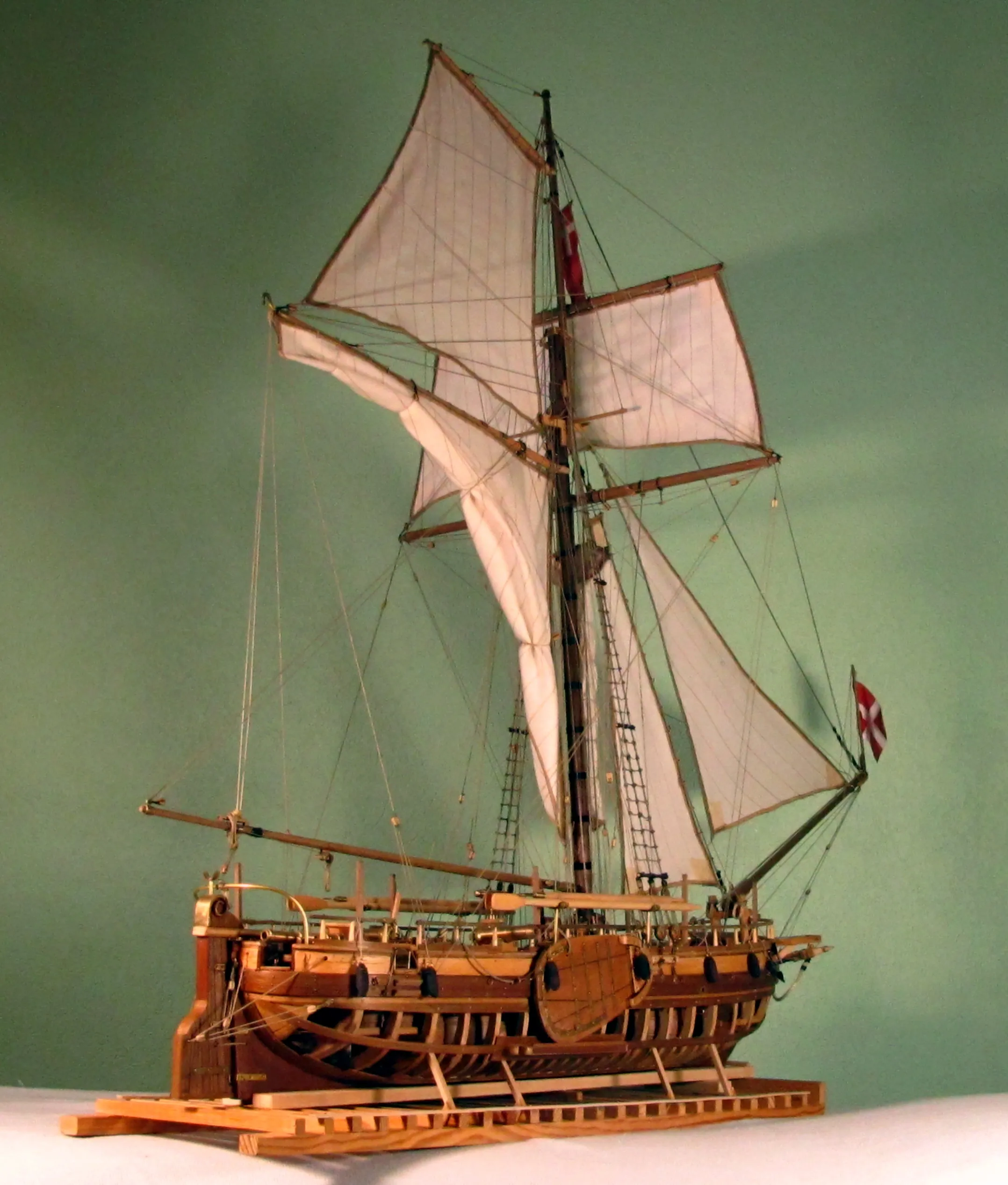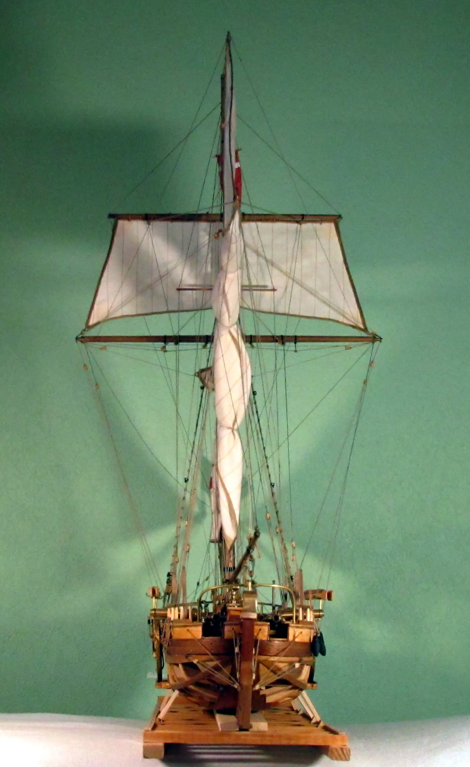 Паруса покупные, из вашего магазина. Немного модернизировал (усилил углы, обшил). При проводке такелажа трудностей не возникло. Чертежи достаточно подробные.