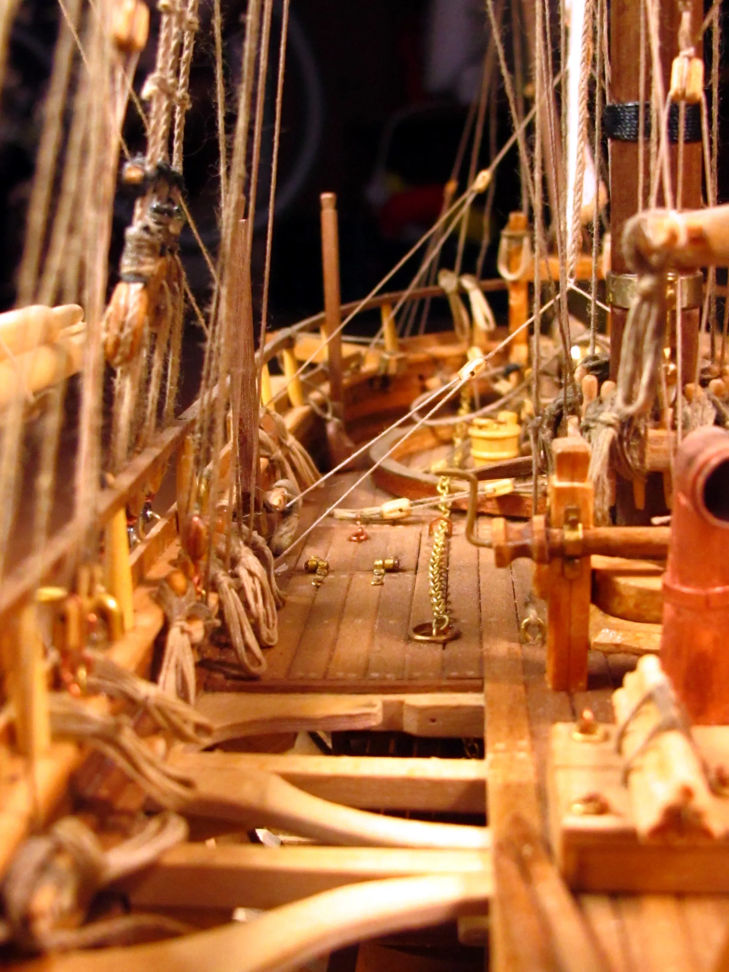 Палуба выполнена со съемными щитами, чтобы видеть "внутренности" (лестницы, перегородки, двери с петлями и ручками, бочки, печки и т.д.).