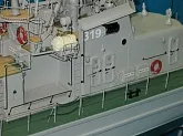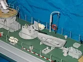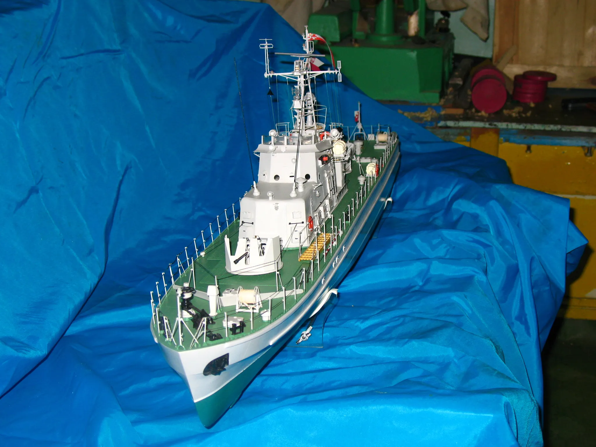 Модель строилась для участия в сореснованиях в классе Ф2Б. Масштаб 1:40. Чертежи из журнала Модельбау-хойте (http://forums.airbase.ru/2009/06/t67481--chertezhi-patrulnogo-katera-tipa-gdansk-polnisces-patrouille.html). корпус стеклопластик. Палуба стеклотекстолит. Рубка, главные орудия из жести. Применялся пластик пвх, целлулойд, акрил, дерево, пленка оракал ( на палубе). Швы делал из нитрокраски - резал тонкие полоски чуть подсохшей краси и приклеивал их на корпус, где на спирт, где на ацетон. Затем свехрху финишная покраска тоже нитро. Силовая установка - два двигателя Спид 400. Для флагов применялась термотрансферная бумага с последующим переносом изображения на ткань.
