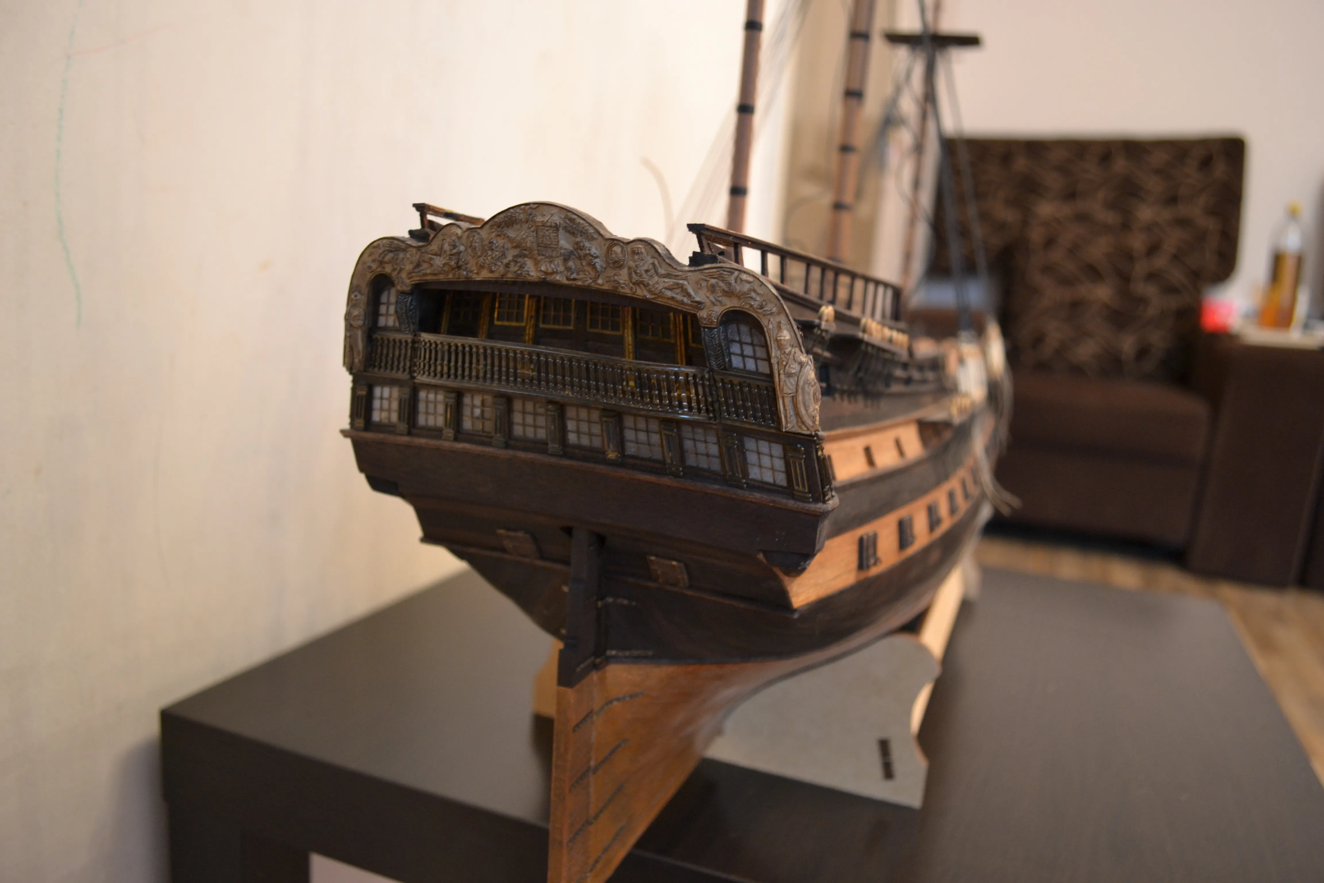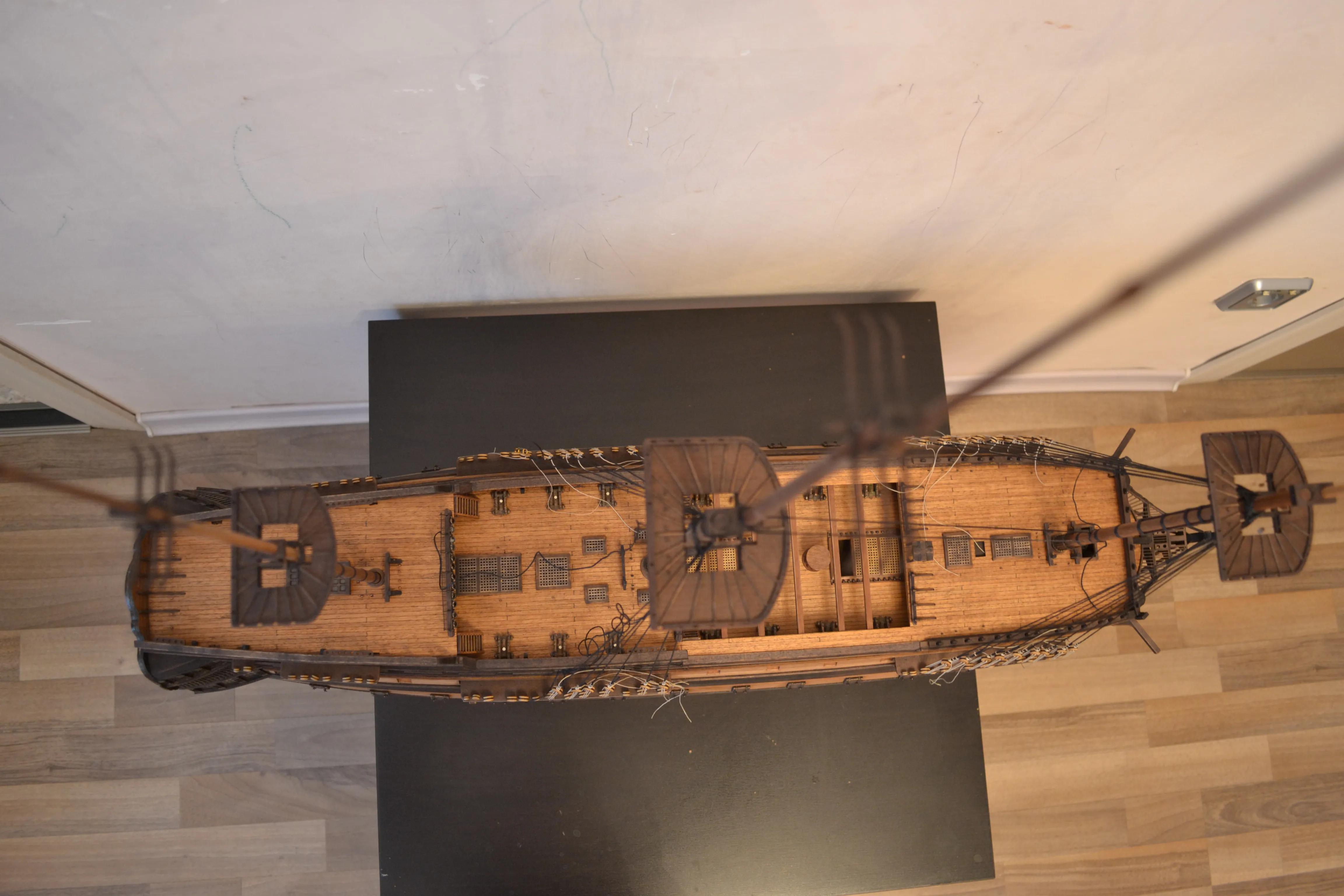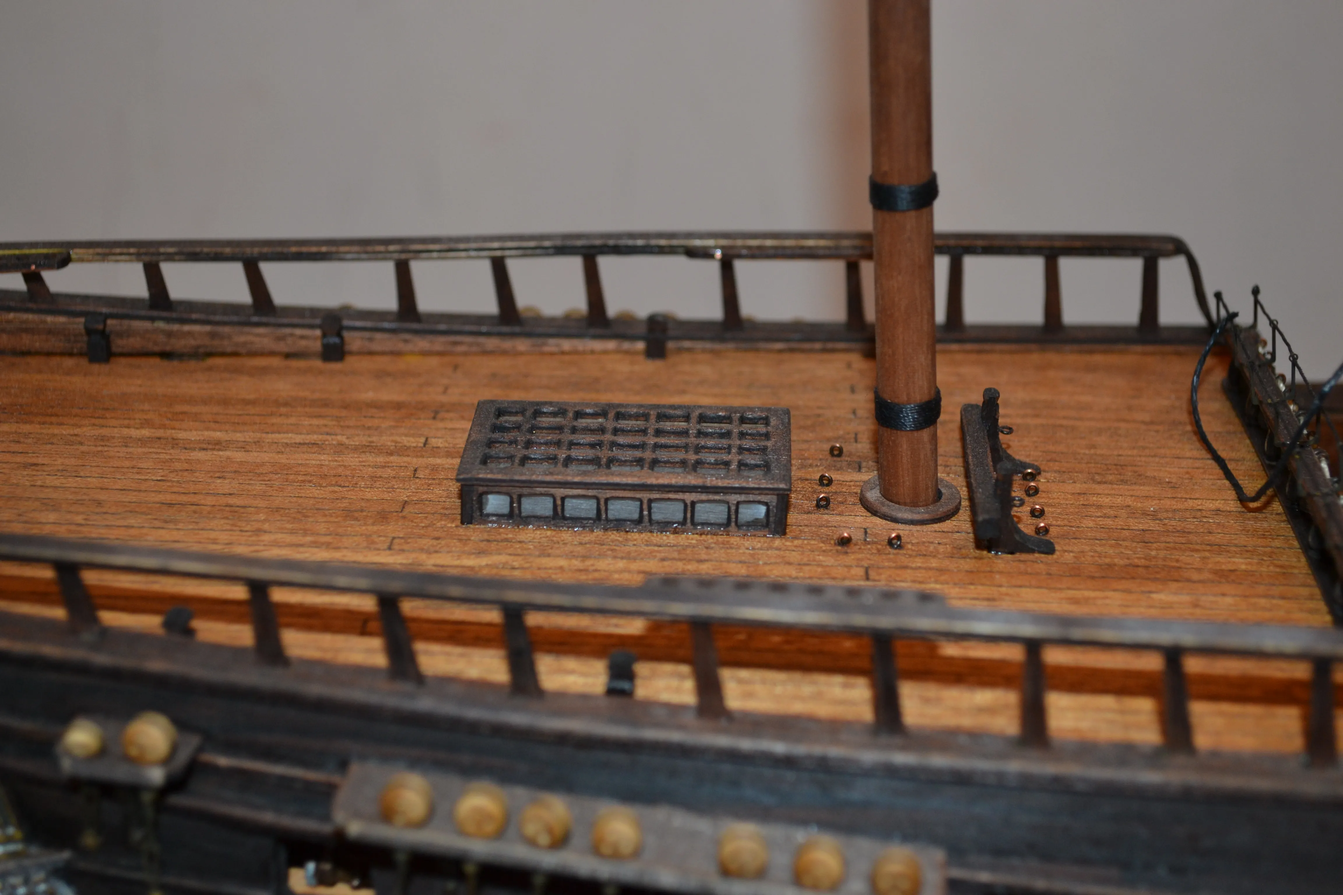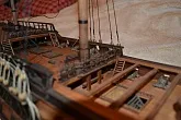 Модель из набора Амати, заменена медная обшивка для новой использовал клейкую ленту из магазина предварительно перфорировал и запатинировал. Черная обшивка из эбена. швы на палубе чернил графитом, готовые детали из набора тонировал морилкой "эбен" модель покрыл маслом тоже из магазина.