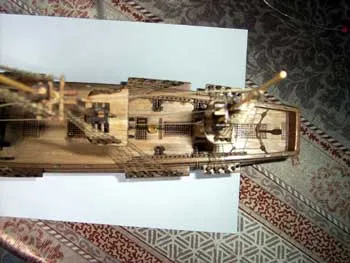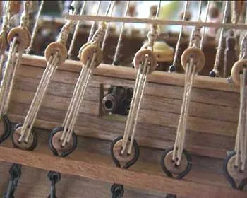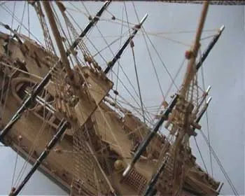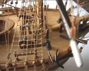 Мачты я ставил <на глаз>. Когда натянул ванты и стоячий такелаж, то мачты стали очень прочными, стоят как вкопанные. Что такелаж бывает черным и светлым, я не знал и сделал все светлыми нитками. И нисколько об этом не расстраиваюсь. Мне важно было как модель смотрится, а не ее копийность. По инструкции ванты нужно было делать из ниток толщиной 0,4 мм, но я решил, что лучше сделать из ниток 0,8мм. Когда я сделал ванты, то они были настолько густыми из-за толщины ниток, что модель за ними не было видно, пришлось снова переделывать, теперь уже как и положено, из ниток 0,4мм. Нижние ванты я вязал как положено, с узелками, а верхние просто приклеивал горизонтальные <ступеньки> к вертикальным нитям.