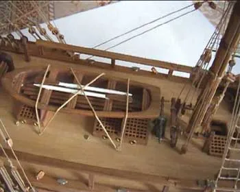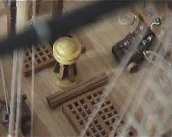 Были доделаны все палубные детали, практически полностью закончен такелаж. После установки всех нужных снастей реи и мачты стоят как вкопанные. Сначала я не стал красить реи, оставил как есть, цветом натурального дерева. Однако модель стала смотреться однородной 'рыжей' массой, ничего на ней не выделялось. Поэтому я решил покрасить реи в коричневый цвет, но и он меня не устроил. Тогда я посмотрел на фотографии модели и на инструкцию: какие там рекомендуют использовать цвета? Оказалось что реи надо окрасить в черный цвет, а их окончания (ноки) в белый. Так я и сделал. Результат меня порадовал. Правда пришлось повозиться, т.к. реи были уже установлены и мне пришлось их окрашивать прямо на модели. Теперь задумываюсь об окраске корпуса ниже ватерлинии и о полосе вдоль борта. Может действительно это будет лучше, чем не окрашенные?