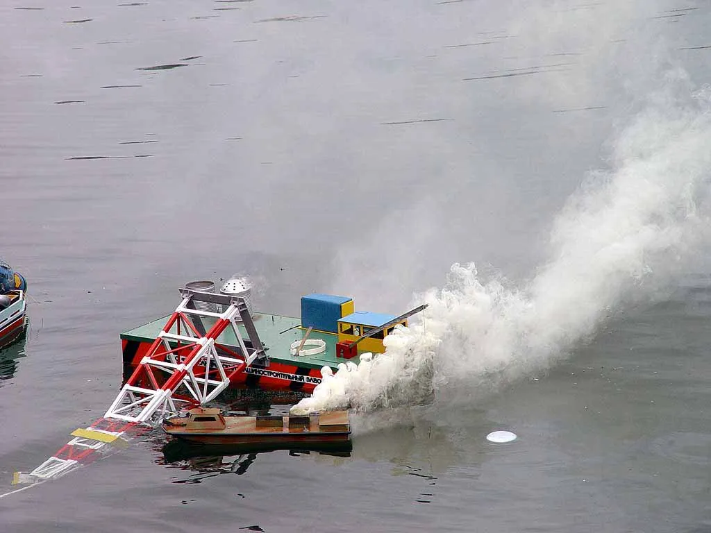 Чемпионат проходил на пруду в парке Дружбы у метро 'Речной вокзал' с 30 июля по 5 августа 2004 года. Участвовали команды Белоруссии, Казахстана, Польши, России, Украины, Чехии. Протоколы чемпионата вы можете найти на сайте NAVIGA. Выступление российской команды тоже было на тему терроризма. Судно с террористами нападает на буровую платформу и на судно сопровождения. Затем само получает повреждения и загорается. Платформу тушит пожарный катер, а спасательное судно чинит платформу и судно сопровождения, заодно вылавливая из воды потерявшиеся во время теракта элементы |