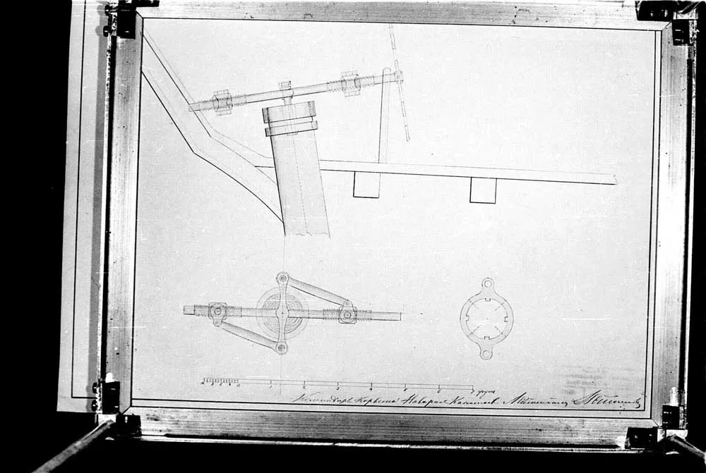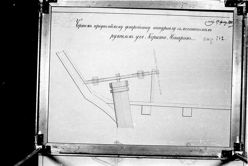Чертеж предполагаемого устройства штурвала с механическим румпелем для корвета "Наварин" |  Чертеж предполагаемого устройства штурвала с механическим румпелем для корвета "Наварин" |  Чертеж нижней палубы 22-х пушечного корвета Наварина. 1831 год. |