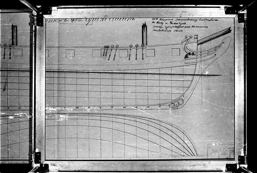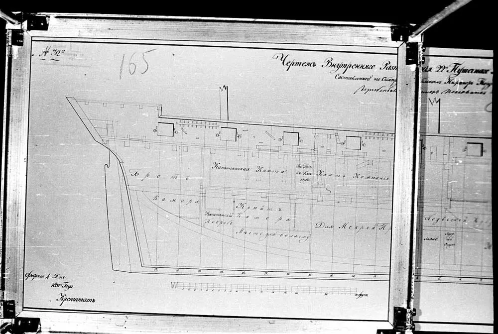 Продолный вид русленей 24-х пушечного корвета Наварина и 44-х пушечного фрегата Константина. |  Чертеж внутреннего расположения 22-х пушечного корвета Наварина. 1831 год. |  Чертеж внутреннего расположения 22-х пушечного корвета Наварина. 1831 год. |