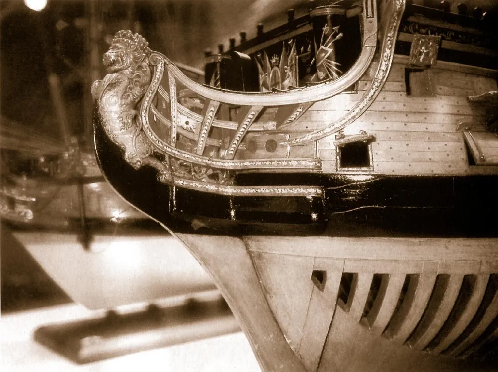 Britannia Квартергалерея правого борта. Квартергалереи и пушечные порты декорированы сложной резьбой. |