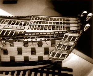 Предыдущая модель, вид на корму показывает двойную квартергалерею, одинарную кормовую галерею, кормовой орнамент в виде двух купидонов, держащих щит с монограммой GR (Georgius Rex: король Георг II), двух облокотившихся купидонов с каждого борта и три кормовых фонаря. |