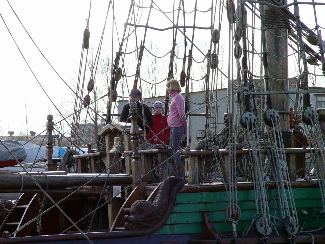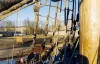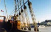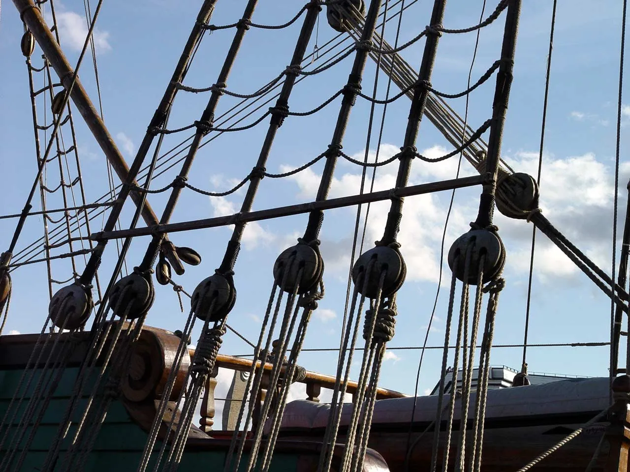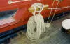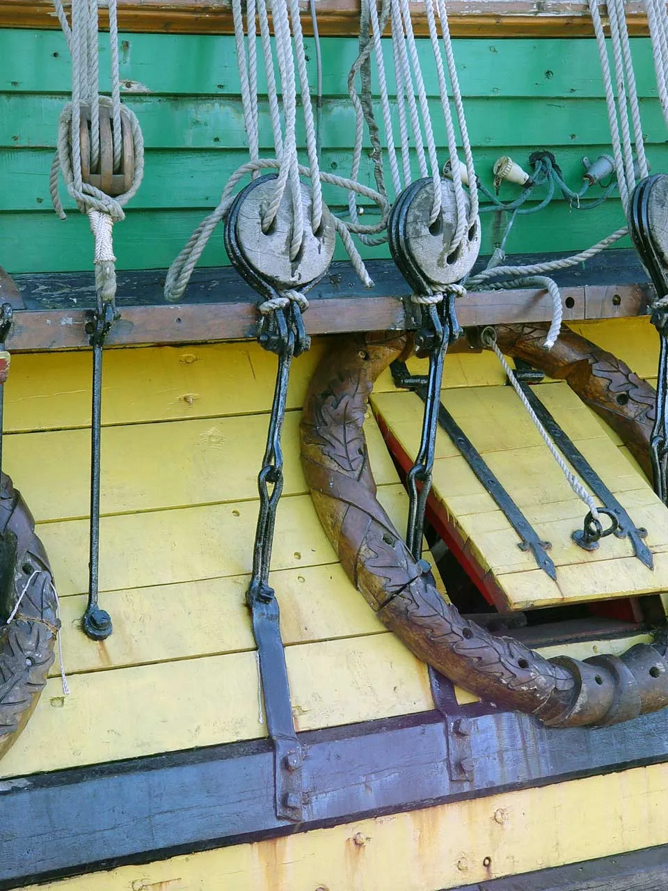 крепление конца на бортовом кнехте, шпигаты в ватервейсе для слива воды с палубы |  крепление бухт на утках |  ванты и юферсы грот-мачты |